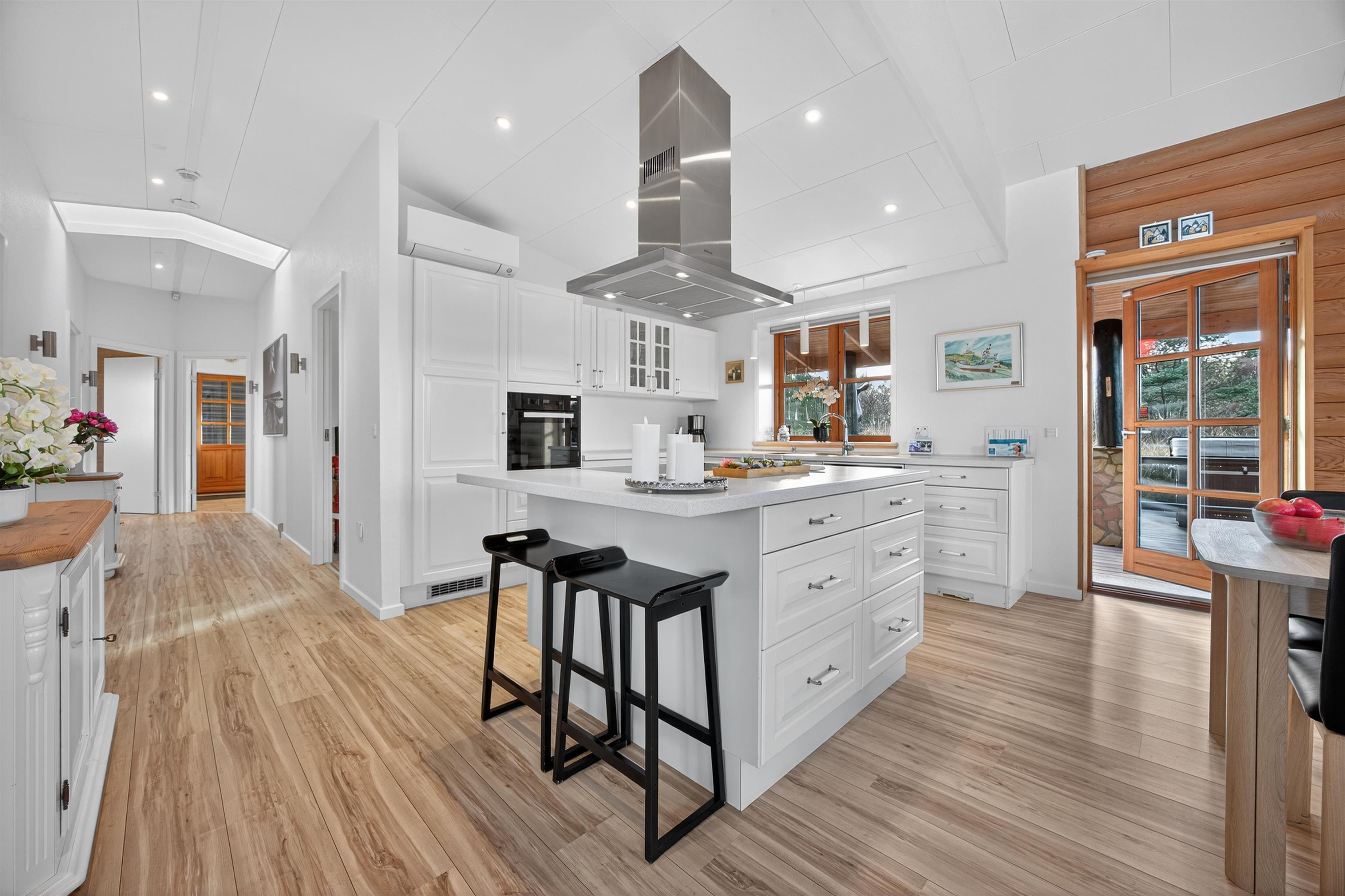 Mehrere Terrassen rund um das Haus ermöglichen es, den Sonnenschein den ganzen Tag über zu verfolgen. Die gemütliche, überdachte Terrasse bietet eine hervorragend ausgestattete Außenküche, einen Essbereich, eine Außendusche sowie eine wunderbare Sauna – perfekt für lange, entspannte Abende, selbst wenn der Tau fällt. Von der überdachten Terrasse gelangen Sie direkt in die große Garage.