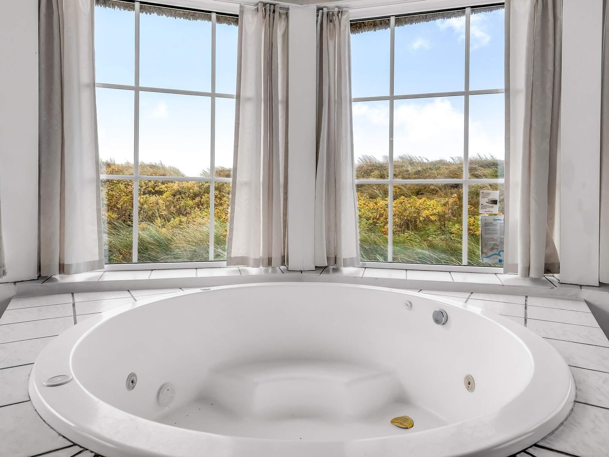 Der Pool des Hauses ist ganze 20 m2 groß. Vorne am Fenster steht zudem ein Whirlpool mit Ausblick zu den Dünen bereit. An kühleren Tagen kann man auch die Wärme in der Sauna genießen.