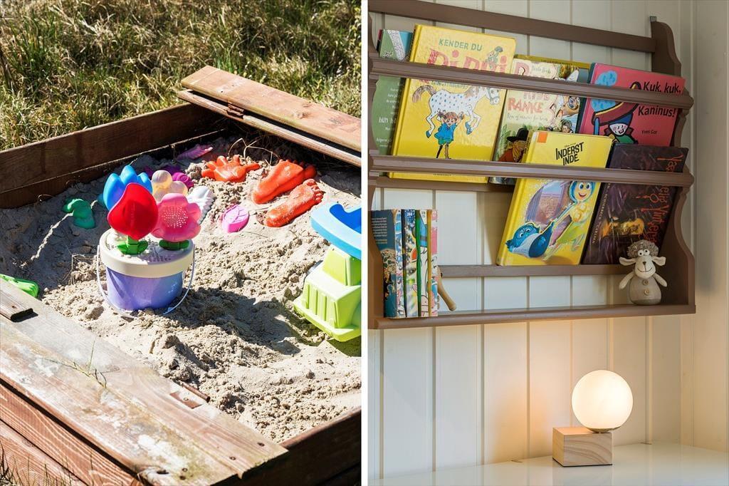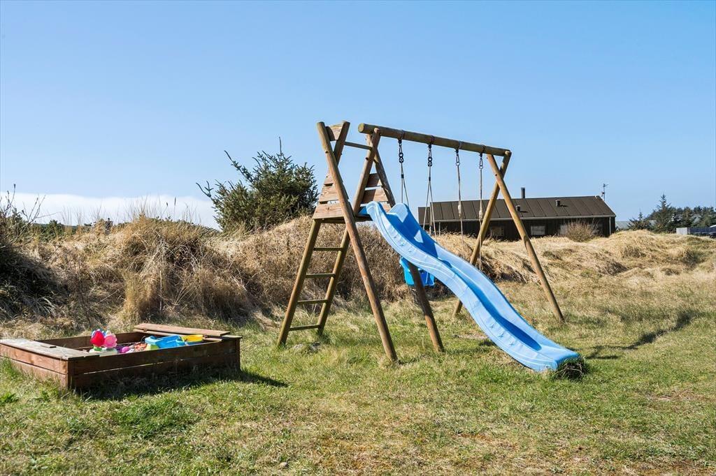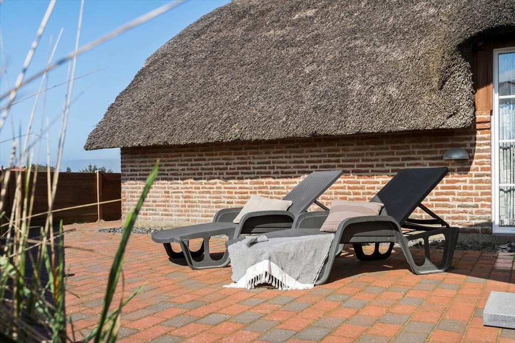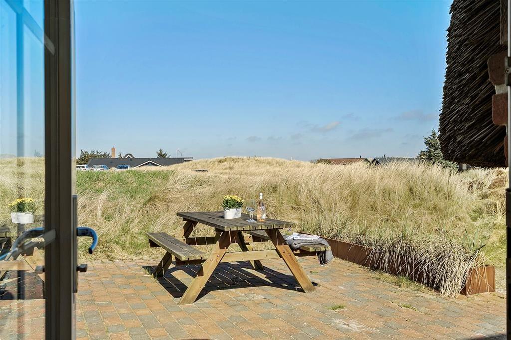 Auf der geschlossenen Terrasse kannst du deinen Urlaub in geschütztem Rahmen genießen; die Kinder können unbeschwert spielen und dein Hund darf mit toben. Die Terrasse ist mit soliden Qualitäts-Gartenmöbeln und einem Grill ausgestattet – perfekt, um leckere Ferienmahlzeiten unter freiem Himmel zuzubereiten. Und besonders wenn die Sonne vom blauen Himmel lacht, ist es herrlich, sich hier draußen aufzuhalten. Die Kinder können im Sandkasten spielen oder sich auf der Schaukel vergnügen, während die Erwachsenen in den Liegestühlen mit einem Buch entspannen oder einem leckeren Kaffee relaxen. An den Abenden ist es richtig schön, sich auf der Terrasse zu versammeln, um gemeinsam das immer wieder beeindruckende Farbenspiel des Sonnenunterganges über den Dünen zu beobachten – ein Erlebnis, das die Urlaubsstimmung auf westjütländische Weise perfekt abrundet.