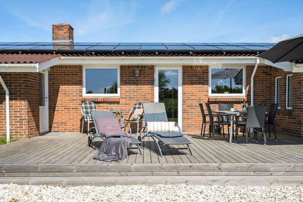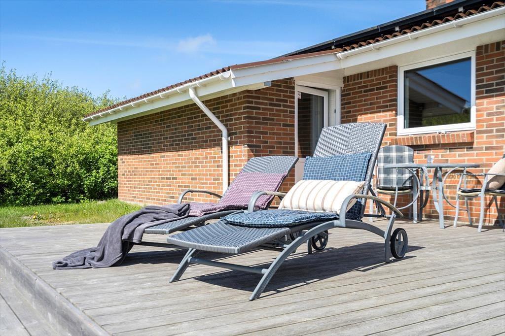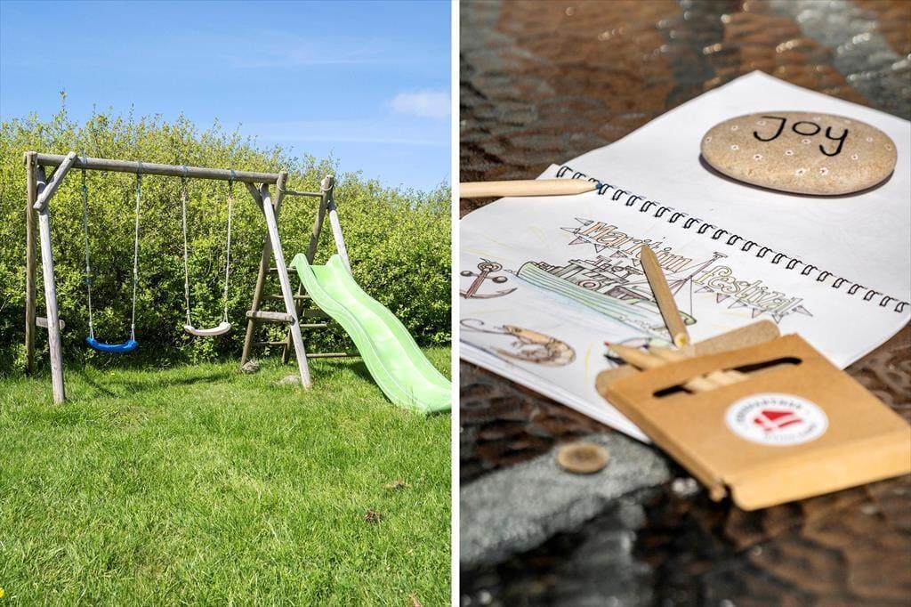 Wenn die Sonne lacht und der Wind sich von seiner sanften Seite zeigt, verlagert sich das Urlaubsleben gerne nach draußen. Auf der großen, offenen Terrasse kannst du es dir auf einer Sonnenliege bequem machen und einfach die Ruhe genießen. Die Jüngsten dürfen im Sand toben – mit Fußballtor, Schaukeln und Rutsche als unterhaltsame Vergnügungen in ihrem kleinen, sicheren Outdoor-Spielparadies. Vielleicht bekommst du Lust, den Grill anzuwerfen und das Abendessen unter freiem Himmel zuzubereiten – oder du schnappst dir ein gutes Buch und genießt die Stille der westjütländischen Dünenlandschaft. Hier ist Platz und Zeit für gemeinsame Familienmomente – doch ebenso Raum für kleine Rückzugsorte, an denen du in deinem eigenen Tempo Ruhe und Entspannung finden kannst.