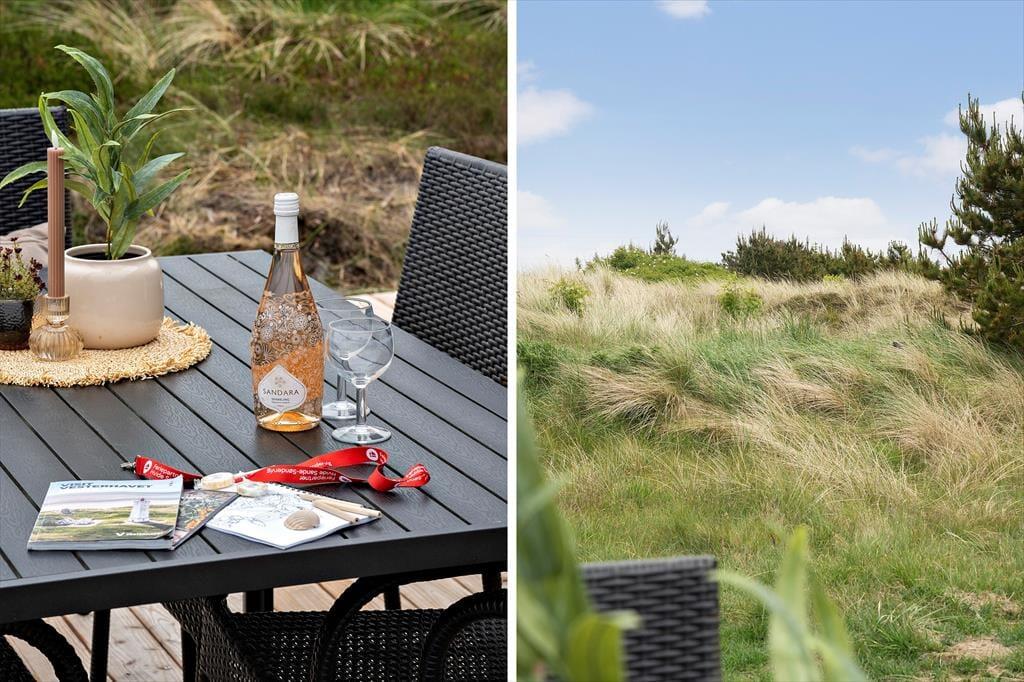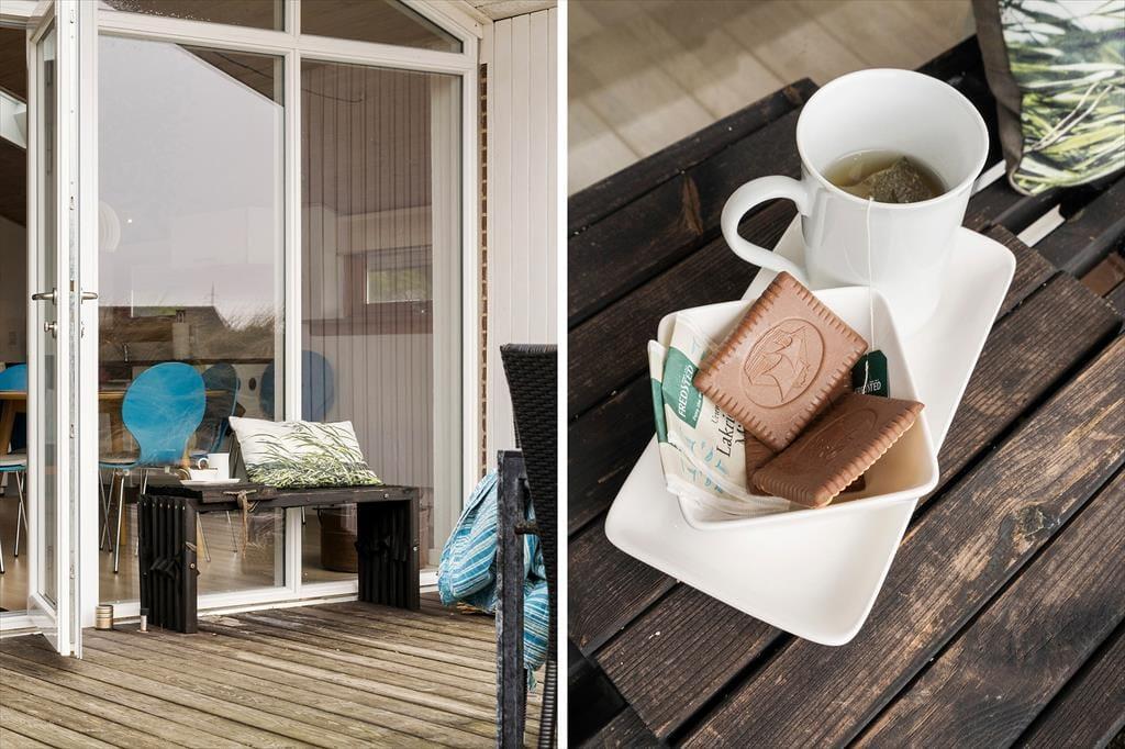 Die große, nach Süden ausgerichtete Holzterrasse ist der perfekte Ort für sonnige Tage. Hier kannst du den Blick auf das ruhige Naturgrundstück genießen, die Vögel zwitschern und den Wind sanft im Gras flüstern hören. Der Terrassenbereich ist teilweise gegen den Westwind abgeschirmt – du kannst also auch bei auffrischendem Wind deine Sommermalzeit im Freien genießen. Nach einem Tag in der Sonne sind die Gartenmöbel gut zum Entspannen und die Ruhe, die nur ein Ferienhaus in der Nähe der Natur bieten kann, auf dich wirken zu lassen. Wenn die Dunkelheit einbricht, kannst du dem warmen Farbenspiel des Abendhimmels zusehen und weiterhin den Abend auch im Freien verbringen.