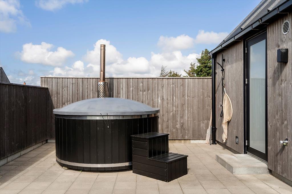 Das Ferienhaus bietet Wellness in exquisiter Umgebung, denn vom Baderaum mit Sauna haben Sie direkten Zugang zu einem abgeschirmten Bereich mit Wildniswanne und Dusche. Wie wunderbar es doch ist, an einem bitterkalten Herbsttag oder einem sternenklaren Sommerabend im warmen Wasser zu sitzen und nur Entspannung auf dem Urlaubsprogramm zu haben! Die große, teilweise überdachte Terrassenlandschaft des Hauses ist rund um die Uhr ein Bonus für Lebensgenießer. Sowohl der Morgenkaffee, das Mittagessen als auch das frisch gegrillte Abendessen können in der Sonne genossen werden, wann immer Sie und Ihre Lieben davon träumen. Gartenmöbel und Liegestühle sind selbstverständlich vorhanden. Auch an der Außen-Möblierung ist die hohe Qualität des Hauses deutlich zu spüren.