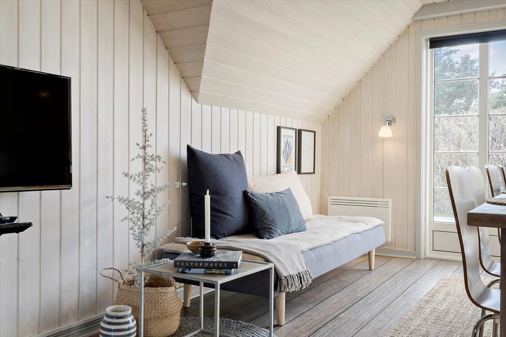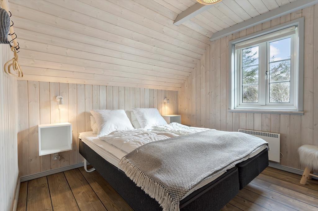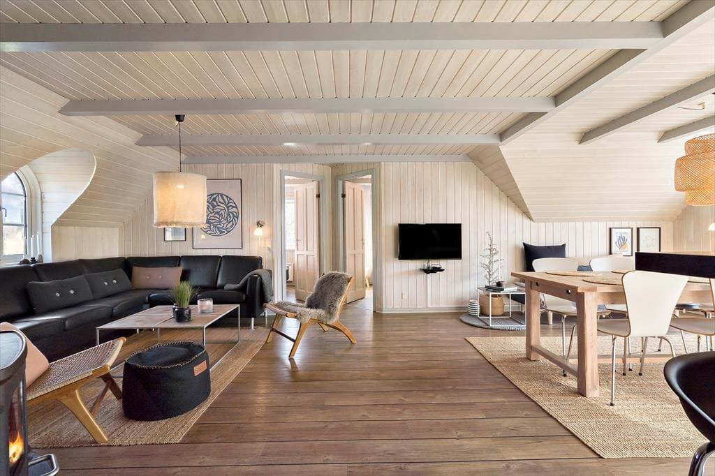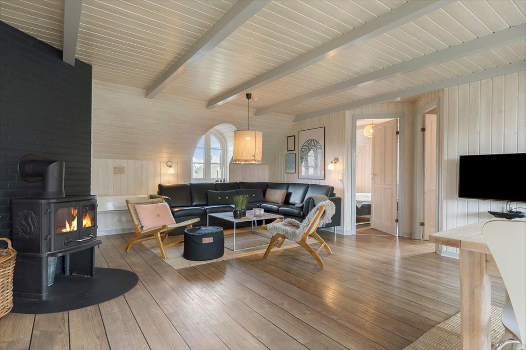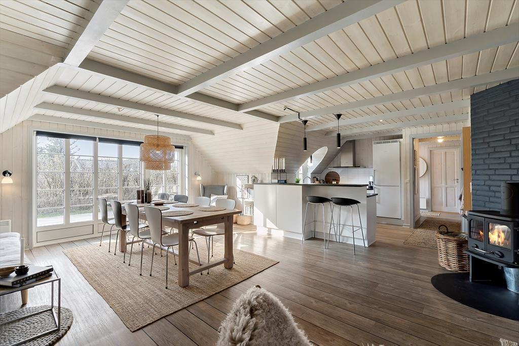 Die vier Schlafzimmer sind gleichmäßig in zwei Abschnitte an den gegenüberliegenden Enden des Hauses aufgeteilt, so dass zwei Familien, die zusammen Urlaub machen, jeweils ihren eigenen Schlafbereich haben. Alle können sich im großen, offenen Wohnbereich treffen, wo Küche und Wohnzimmer zu einer Einheit verschmelzen und die Wärmepumpe und der Holzofen für angenehme Temperaturen sorgen. Kochen Sie gemeinsam in der modernen Küche und lassen Sie den Geschirrspüler die Arbeit erledigen, während Sie es sich am Esstisch oder auf den weichen Möbeln gemütlich machen. Wi-Fi und Flachbildfernseher sorgen für Unterhaltung, und im Abstellraum gibt es einen Bob, einen Mini-Kicker und andere lustige Spiele. Neben der Eingangshalle verfügt das Ferienhaus über eine separate Toilette und ein Wellnessbad mit begehbarer Dusche, wo Sie sich im Whirlpool oder im heißen Dampf der Sauna entspannen können.
