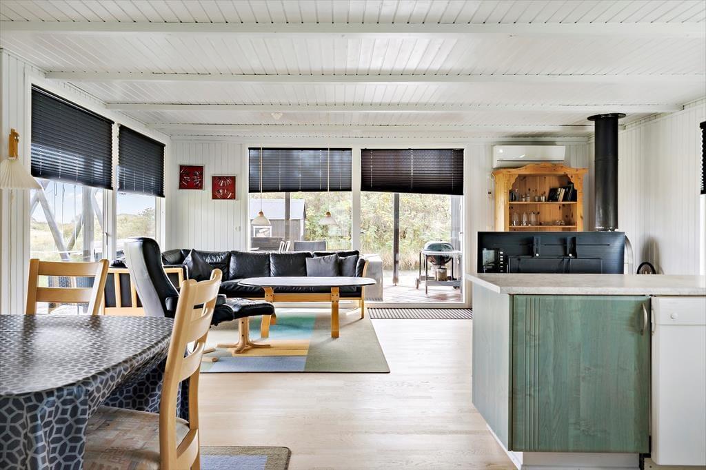 Vom Wohnraum aus treten Sie hinaus auf das nach Osten und Süden weisende Terrassenareal, das sich in einen überdachten und einen komplett offenen Bereich unterteilt. Während Sie sich tagsüber auf dem offenen Bereich nach Herzenslust sonnen, spendet die Überdachung Windschutz und bietet sich sehr schön für einen entspannten Grillabend an. Von den Außenbereichen aus blicken Sie über Felder, Wiesen und den Fjord. Die kleinen Urlauber erfreuen sich an einer Grasfläche, an einer Schaukel und an einer Sandkiste.
