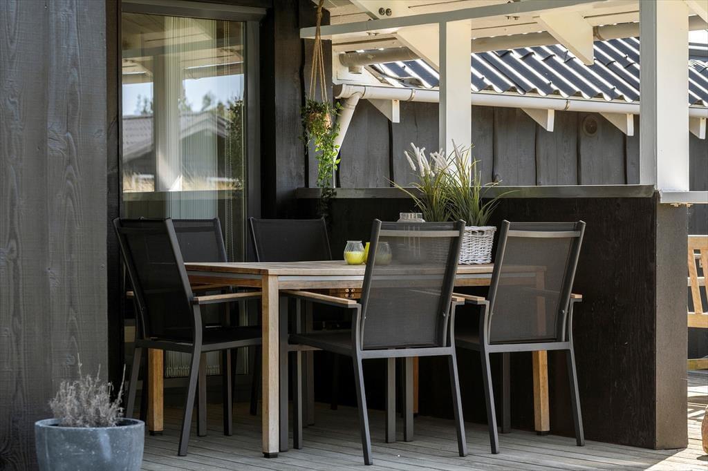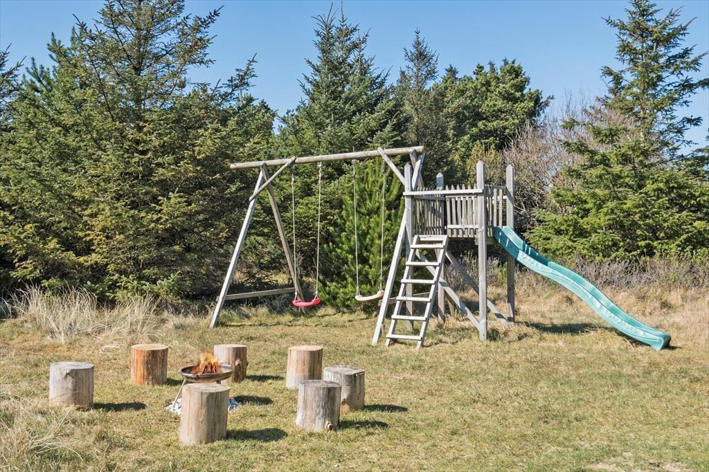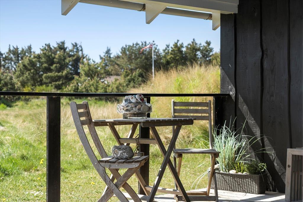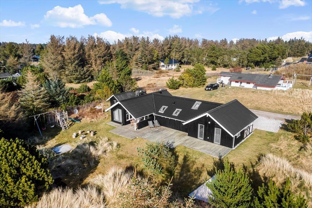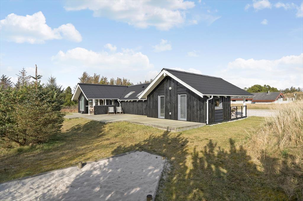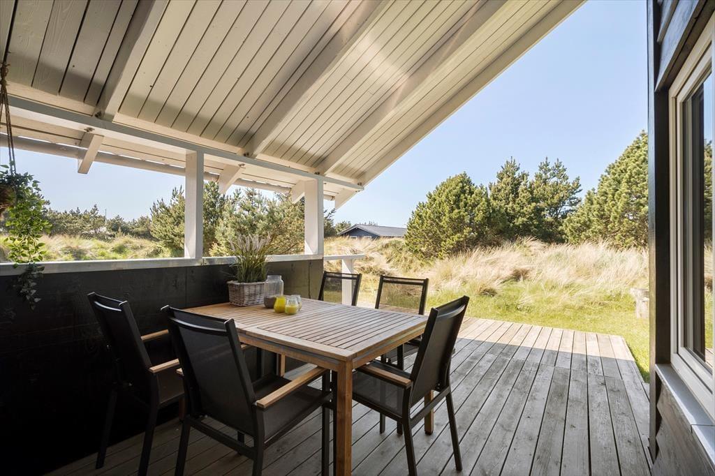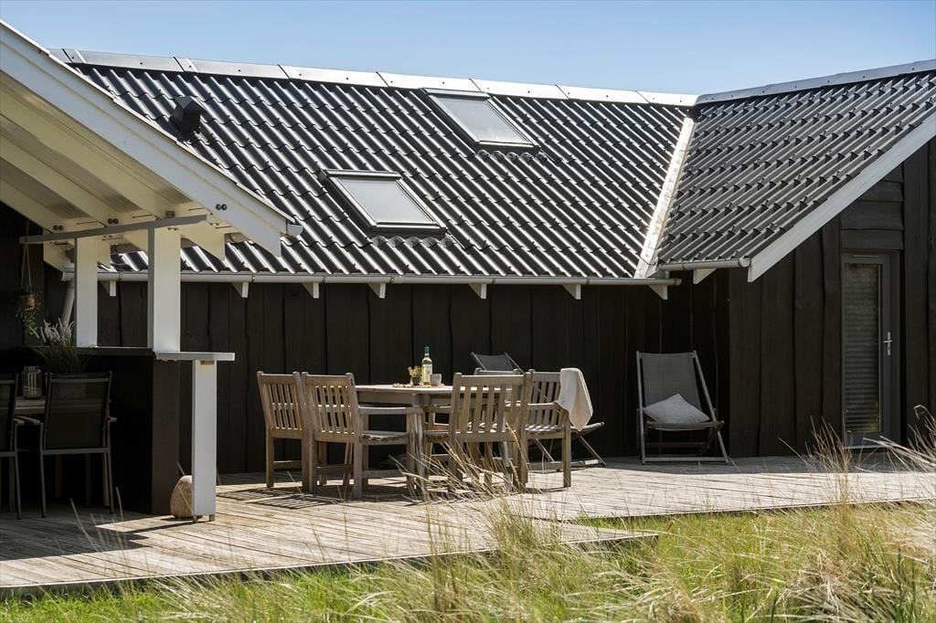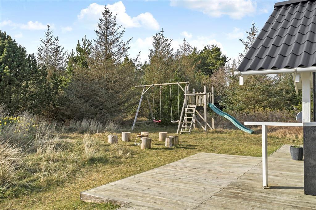 Viel Platz zum Spielen und Erholen bietet das 2.050 m² große Naturgrundstück. Die jüngsten Gäste dürfen sich auf eine Sandkiste und einen Spielturm mit Schaukeln freuen. Die Grasfläche animiert zum Ballspielen und Umhertollen. Ihre Kinder werden es lieben, in den kleinen Dünen auf dem Grundstück Verstecken zu spielen. Die große, nach Westen ausgerichtete Holzterrasse ist ein perfektes Plätzchen für ausgedehnte Sonnenbäder und gesellige Grillabende. Falls Sie eher den kühlen Schatten bevorzugen, machen Sie es sich auf den überdachten Bereichen an beiden Hausseiten gemütlich. Stimmungsvoll geht es allabendlich rund um die Lagefeuerstelle zu.
