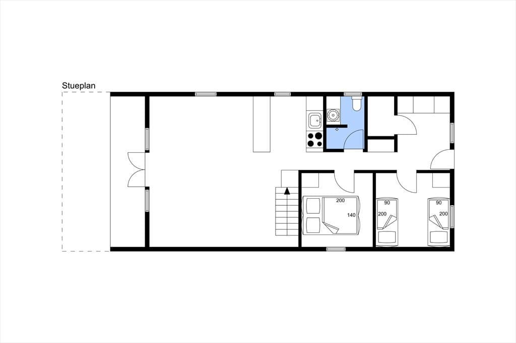 Mit seinen zwei Schlafräumen und den beiden Betten auf dem Schlafboden eignet sich dieses Ferienhaus gut für vier Erwachsene und zwei Kinder. Beide Schlafzimmer befinden sich an einem Ende des Hauses - neben dem Duschbadezimmer und dem Hauswirtschaftsraum mit Waschmaschine und Wäschetrockner. Am anderen Ende des Hauses empfangen Sie der Wohnraum und die offen integrierte Küche. Vom Wohnraum aus gelangen Sie über eine Leiter hinauf auf den Schlafboden. Die Küche bietet alles, was Sie für die Zubereitung Ihrer Mahlzeiten benötigen. Der gemütlich möblierte Wohnraum lädt zu gemütlichen Stunden ein, die Sie mit geselligen Mahlzeiten am Esstisch, mit vergnügten Spielrunden und stimmungsvollen Filmabenden nah am Kaminofen verbringen.