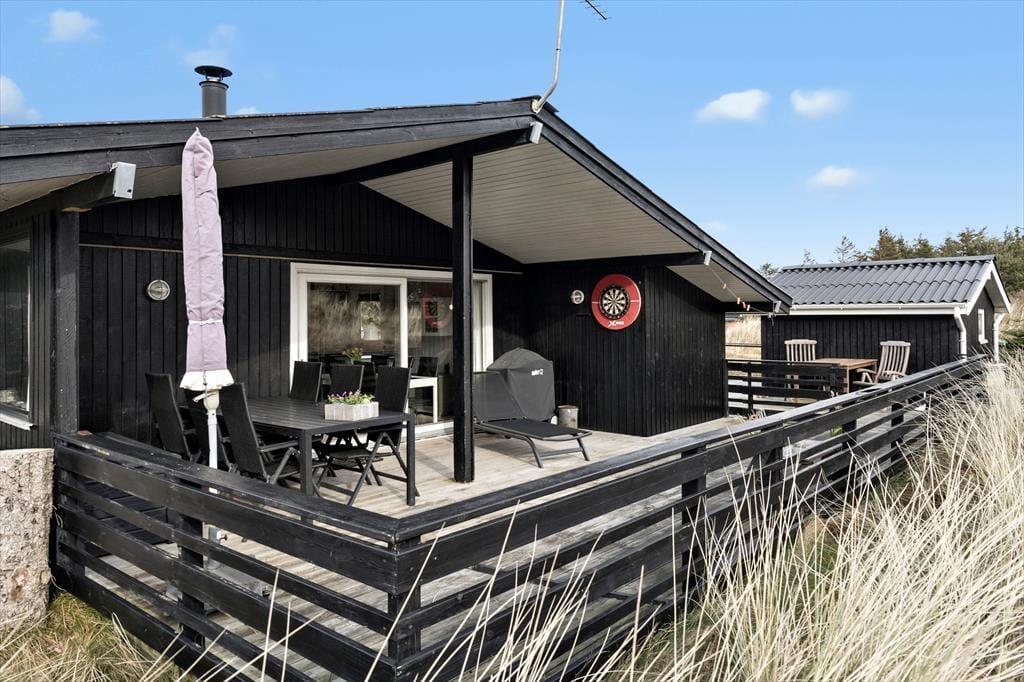 Rund um das Ferienhaus haben Sie die Wahl zwischen mehreren Terrassen. Die nach Süden ausgerichtete Terrasse ist komplett mit einem Zaun umschlossen - was Hundehalter und Eltern von kleinen Kindern sehr begrüßen dürften. Sie ist darüber hinaus teilweise überdacht. Es stehen Ihnen mehrere bequeme Gartenmöbel zur Verfügung. Die Kinder können sich mit der Schaukel und an der Kletterwand austoben. Möchten Sie jedoch die Seele ein wenig baumeln lassen, bietet sich die Bank auf der hohen Düne an, von wo aus Sie die herrliche Aussicht über die Landschaft genießen können - von dort aus können Sie ebenfalls über den Ringkøbing Fjord und bei klarer Sicht sogar bis nach Ringkøbing schauen.