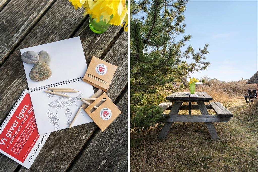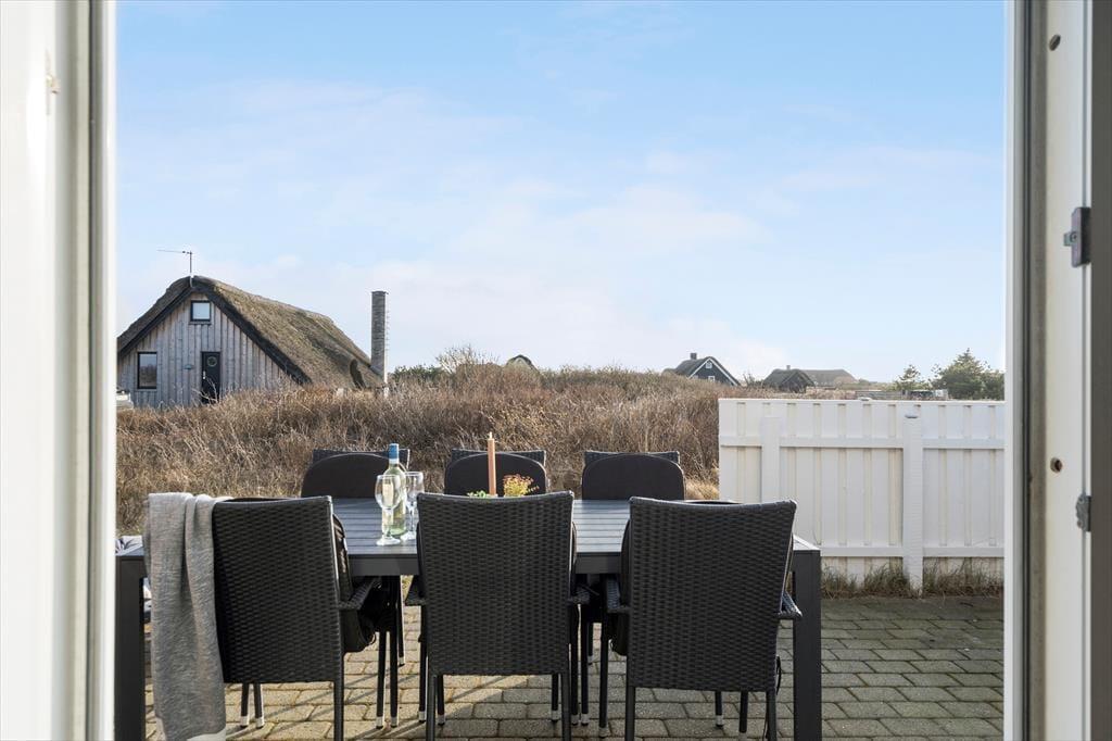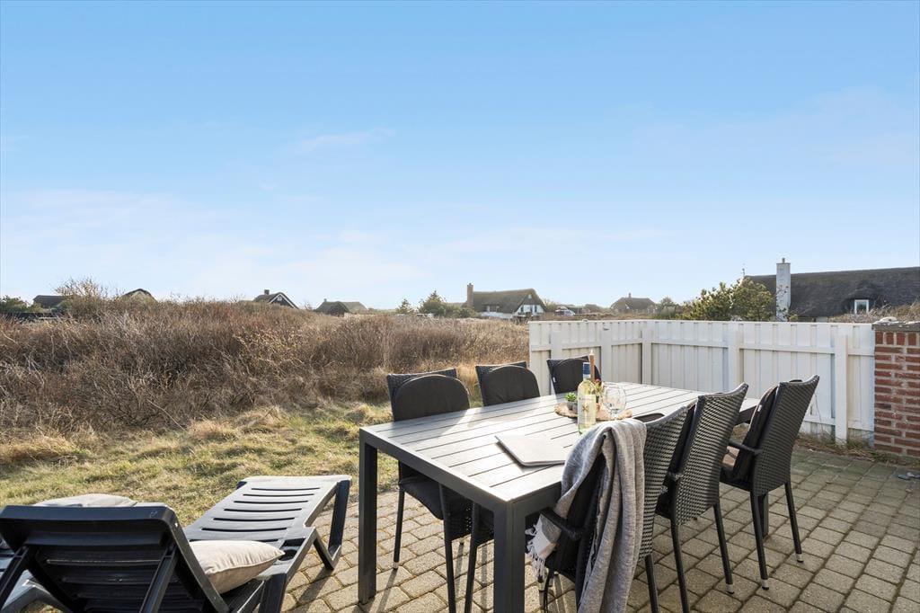 Vom Wohnraum aus gelangen Sie direkt hinaus auf eine Südterrasse, die durch ein hölzerne Terrassenumrandung an der Westseite abgeschirmt wird. Auf der Terrasse blicken Sie über Ihr Naturgrundstück, das eine Fläche von 1.850 m² umfasst. Sie wohnen am Ende eines kleinen Seitenweges, der vom großen Nordsø Ferievej abzweigt. Hier geht es angenehm ruhig und beschaulich zu und es bieten sich Ihnen beste Möglichkeiten, sich in ein gutes Buch zu vertiefen und ausgedehnte Sonnenbäder zu genießen.