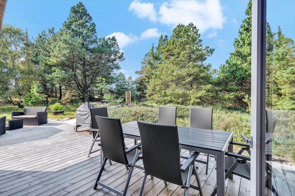 Eine große Terrasse erstreckt sich über drei Seiten des Hauses und bietet Platz zum ungestörten Sonnen, Grillen und einfach nur, um den Tag ganz in Ruhe zu verbringen. Auf dem überdachten Areal steht, wenn du Schatten brauchst, ein Sonnenschirm zur Verfügung. Träumst du von Wellness und Entspannung, ist der perfekte Urlaubstag im Ferienhaus, den Tag im Wildnisbad ausklingen zu lassen, die Aussicht auf die schönen Bäume des Naturgrundstücks zu genießen oder in den Sternenhimmel zu schauen.