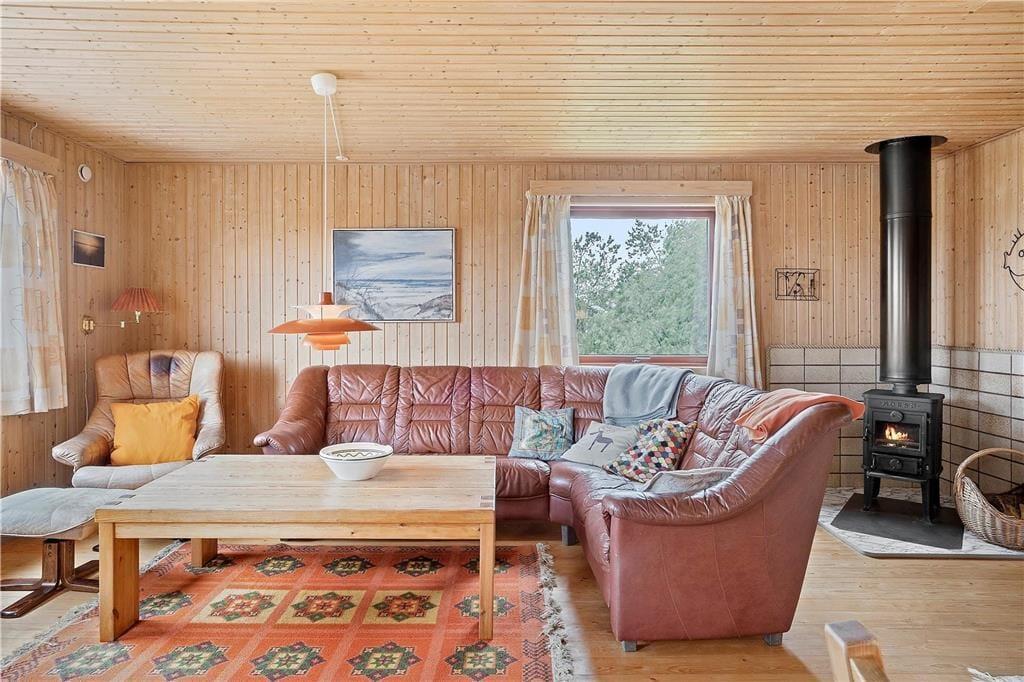 Im Inneren des Hauses herrscht eine helle und freundliche Atmosphäre, denn die vielen Fenster geben nicht nur den Blick nach draußen frei, sondern sorgen auch für einen wunderbaren Lichteinfall. Im besten Ferienhaus-Stil gibt es rustikale Holzleisten an den Wänden und einen Brennofen im Wohnzimmer, und die gemütlichen Möbel tragen zur angenehmen Atmosphäre bei. Stube und Küche bilden zusammen einen großen und schönen Wohnraum, in dem du kochen, Gesellschaftsspiele spielen, einen guten Film schauen oder andere gemeinsame Urlaubsaktivitäten unternehmen kannst. Die gemütlichen Momente kannst du auch im Wintergarten verbringen, wo der Panoramablick wirklich beeindruckend ist – und wenn es draußen kühl ist, gönn dir einige Stunden in der hauseigenen Sauna. Die Raumaufteilung umfasst außerdem ein Badezimmer und drei Schlafzimmer, und alle Räume präsentieren sich ordentlich und gepflegt.