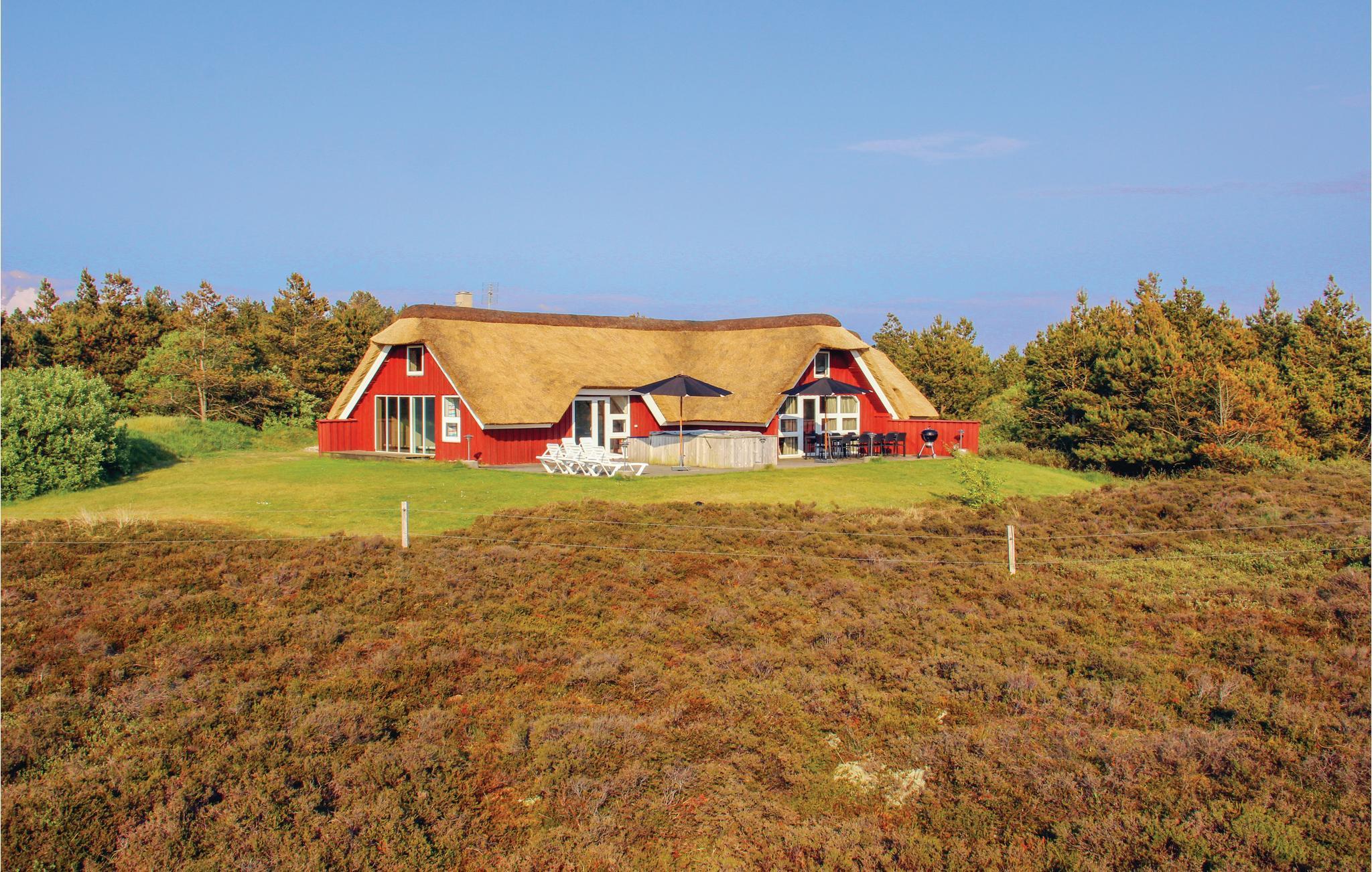 Dieses attraktive, reetgedeckte Ferienhaus in Kongsmark liegt auf einem schönen, heidebewachsenen Grundstück in absolut ruhiger Traum-Lage. Das gepflegte Holzhaus bietet eine fantastische Aussicht auf die Dünenlandschaft des Naturschutzgebietes.