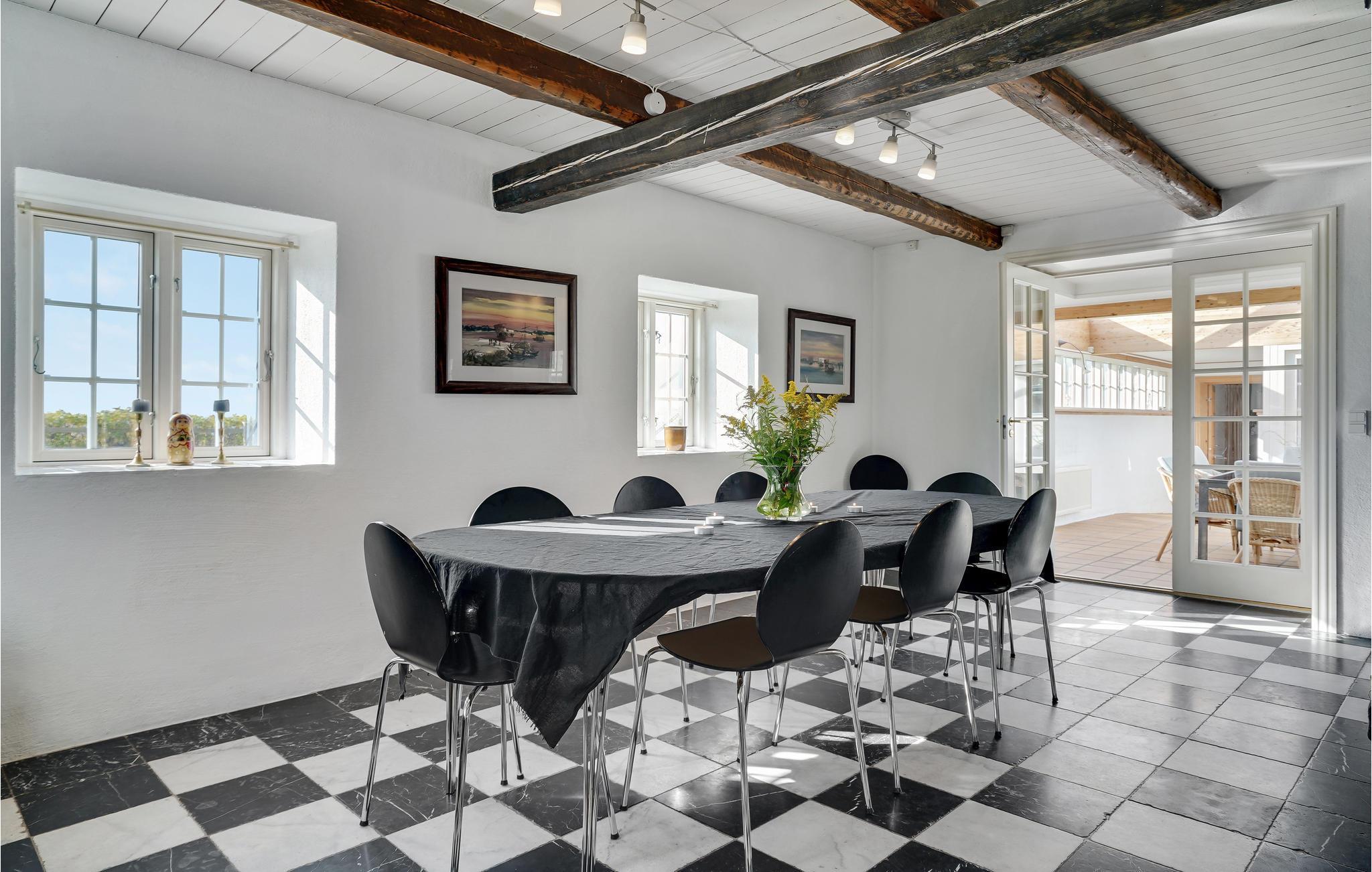 Dreiflügeliger, zum Ferienhaus umgebauter Hof/Landsitz nur 50 m von der Küste entfernt, mit einzigartiger Aussicht auf die Große Belt Brücke. Im Haus gibt es eine schöne, französisch inspirierte Wohnküche mit Kamin, wo die ganze Familie am Esstisch Platz findet. Die zwei Flügel sind durch einen Wintergarten mit viel Glas verbunden, von wo aus Sie in den Hofgarten gelangen, der das Zentrum aller Gebäude bildet. Es gibt noch eine weitere Terrasse, auf der Sie die sonnigen Tage genießen können, während der Grill angemacht wird oder ein Feuer an der Feuerstelle.