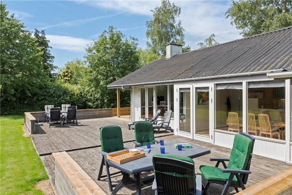 Liegt auf einem schönen Grundstück mit schönen Sträuchern und Bäumen rundherum, viel Rasenfläche zum Ballspielen und Spielen und nicht zuletzt der großen, schönen Holzterrasse, die mit Gartenmöbeln und einem Außenkamin ausgestattet ist.