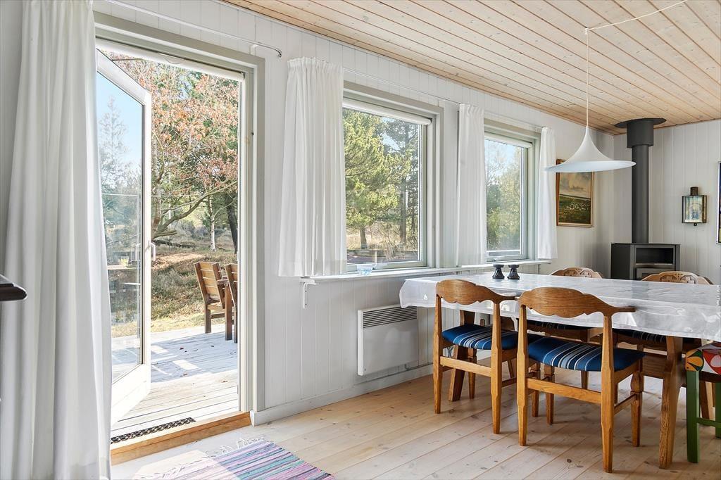 Dieses charmante Ferienhaus in Kromose, heißt dich mit seiner individuellen Einrichtung und gemütlichen Atmosphäre willkommen. Im Inneren empfängt dich ein Ambiente, in dem Persönlichkeit und Komfort Hand in Hand gehen. Große Fenster laden die Umgebung ins Haus ein und fluten es mit Licht. Das Wohnzimmer ist ein perfekter Ort zum Entspannen mit bequemen Möbeln, während ein knisternder Brennofen an kühleren Tagen Wärme und Gemütlichkeit verbreitet. Hier kannst du die Aussicht auf die majestätischen Kiefern und das schöne Heidekraut genießen, die das Haus umgeben.
