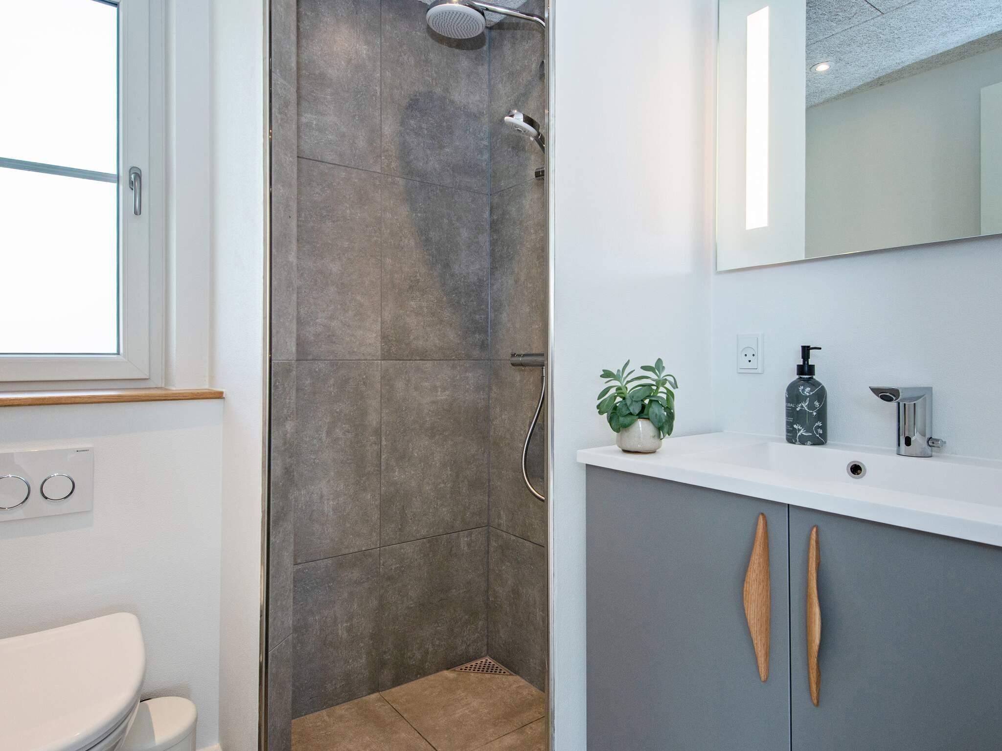 Bad: WC, Waschb., Dusche, Fußbodenheiz.