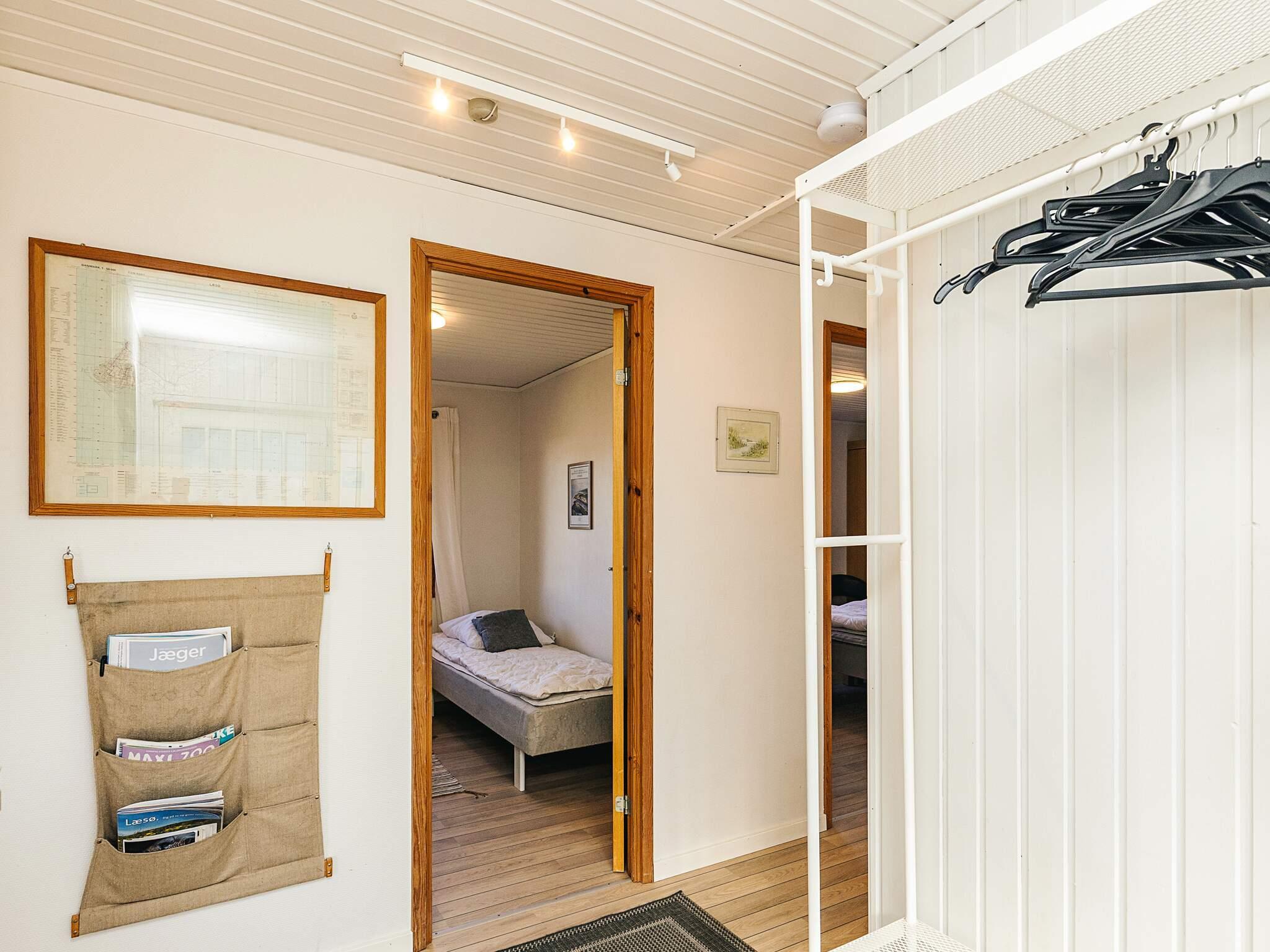 Innen offenen Küchen-/Wohnbereich für das Familienleben, mit bodentiefen Fenstern Richtung Garten und viel Tageslicht. Im Haus auch Eingangsdiele, drei Schlafzimmer mit Staufläche und ein Badezimmer mit Dusche. Das Doppelbett ist schmal.