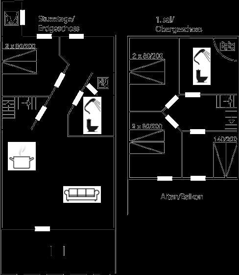 Die Schlafplätze des Hauses verteilen sich auf 2 Zimmer mit Doppelbett und 1 Zimmer mit 3/4-Bett (120 cm) im Obergeschoss sowie 1 Zimmer mit Doppelbett im Erdgeschoss.