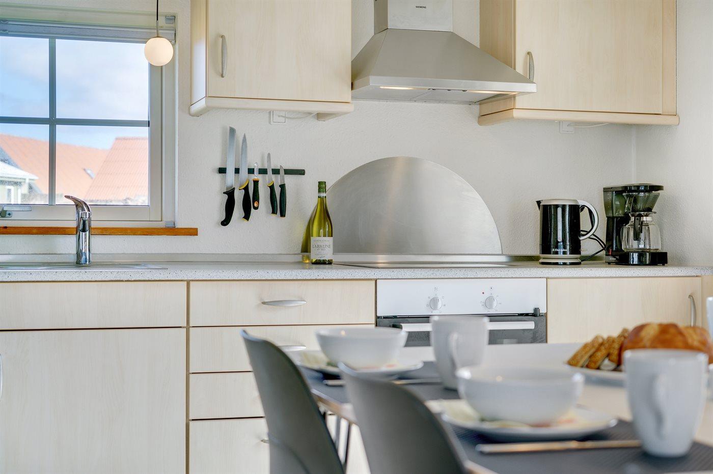 Die Küche ist mit Kühlschrank ausgestattet. Außerdem gibt es 4 Keramik-Kochfelder, Umluftofen, Mikrowelle sowie Geschirrspüler.
