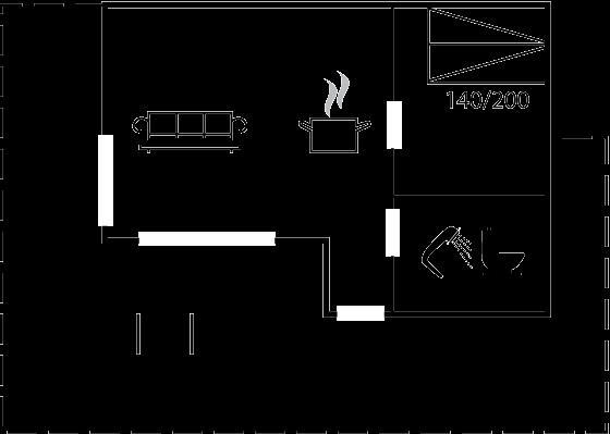 Es gibt einen Schlafraum. 2 Schlafplätze in einem Doppelbett. 2 Schlafplätze auf Matratzen. 2 von diesen Schlafplätzen befinden sich im offenen Obergeschoss.