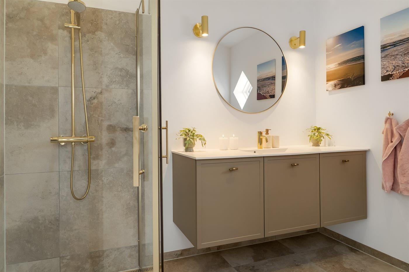 Es gibt 1 Badezimmer mit Duschnische und 2 Toiletten, davon 1 Gästetoilette. Fußbodenheizung in 1 Badezimmer. Fußbodenheizung in der Gästetoilette.