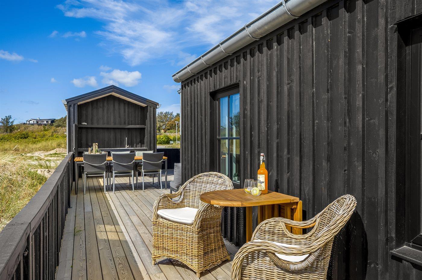 Die Ferienunterkunft liegt auf einem 270 m² großen Dünengrundstück. Die Entfernung zum Meer beträgt 500 m. Die nächste Einkaufsmöglichkeit liegt 400 m entfernt. Es steht ein geschlossenes Terrassenareal zur Verfügung.Es beteht die Möglichkeit das Essen in der Außenküche zuzubereiten. Es steht ein Grill zur Verfügung. Es steht ein Carport zur Verfügung. Parkplatz auf dem Grundstück.