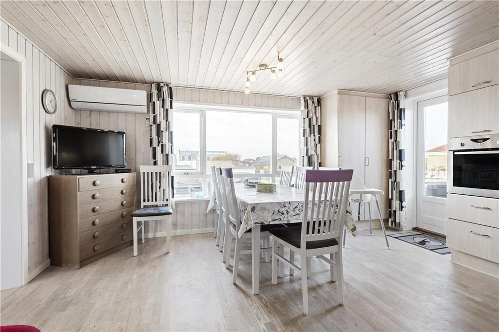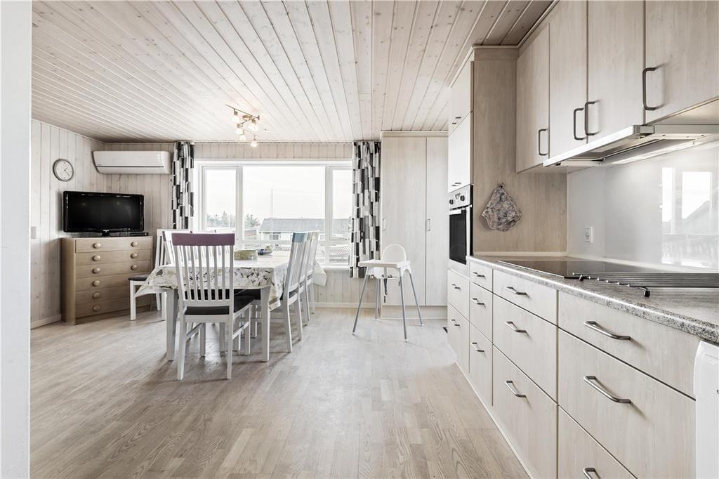 Sie betreten dieses Ferienhaus durch einen Eingangsbereich mit Windfang. Der Wohn- und der Essbereich bilden eine offene Kombination mit der schlichten, funktionellen Küche. Dieser Raum verspricht das gesamte Jahr hindurch einen entspannten, gemütlichen Urlaub. Ihnen stehen zwei Schlafräume mit jeweils einem Doppelbett und ein Schlafraum mit einem Etagenbett zur Verfügung. Das Badezimmer ist mit einer Duschnische ausgestattet. Im Flur stehen eine Waschmaschine und ein Wäschetrockner für Sie bereit. Sollte sich das Wetter einmal nicht von seiner schönsten Seite zeigen, sorgt der Kamin für heimelige Wärme und die typisch dänische Ferienhausstimmung. Machen Sie es sich einfach auf den ansprechenden Sofas oder am Esstisch gemütlich, vertiefen Sie sich in ein spannendes Buch oder spielen Sie gemeinsam mit Ihren Lieben ein vergnügliches Brettspiel.