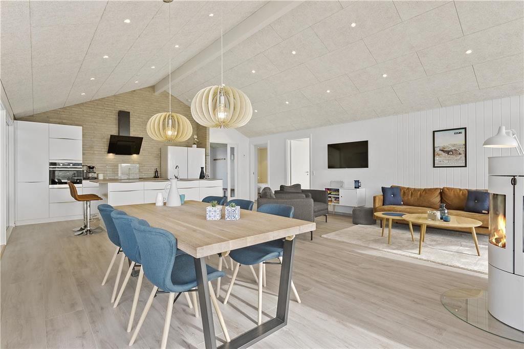 Das Haus verfügt über ein Carport nahe dem Haus, wo Ihr Fahrzeug im Windschutz steht und von wo aus Sie das Gepäck problemlos ins Haus befördern können. Der Flur ist geräumig mit viel Platz für Ihre Oberbekleidung und Schuhe. Der Hauswirtschaftsraum enthält eine Waschmaschine und einen Wäschetrockner. Von hier haben Sie einen Zugang zu einem Badezimmer. Der Flur führt Sie direkt in einen sehr großen Aufenthaltsraum bestehend aus Küche und Wohnzimmer mit großen Fensterpartien im Giebel, die einen optimalen Lichteinfall den ganzen Tag lang sicherstellen. Das Ferienhaus ist geschmackvoll eingerichtet mit einer gemütlichen Sofagruppe in Verbindung mit einem topmodernen Kaminofen. Die attraktive, offene Küche verfügt über eine Kücheninsel. Der Essbereich ist im anderen Teil des Raumes platziert und verstärkt dadurch das Gefühl eines großen und großzügigen Raumes. Von hier aus erreichen Sie die zwei Schlafzimmer, beide mit Zugängen zur Terrasse. Auf der anderen Seite des Hauses erwartet Sie der Aktivitätsraum , mit einem Fernseher, einer Spielekonsole sowie einem Billardtisch und einer Tischtennisplatte. Insofern bieten sich Ihnen selbst bei schlechtem Wetter viele Möglichkeiten der Unterhaltung und Aktivität. Eine Leiter führt zum ausgebauten Dachboden mit drei Matratzen. Vom Aktivitätsraum aus gelangen Sie in die beiden letzten Schlafzimmer. Im Aktivitätsraum steht zudem ein Schlafsofa für zwei Personen bereit. Von hier aus genießen Sie einen Zugang zum großen Badezimmer mit einer Dusche und einem Whirlpool.