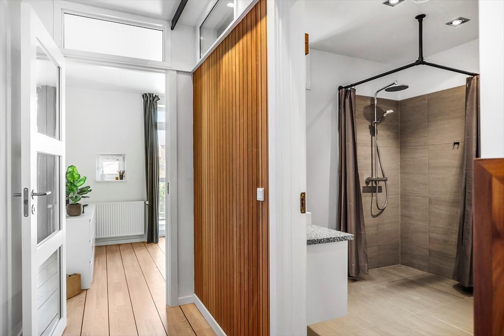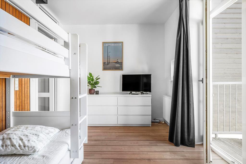 Die Wohnung bietet Platz für vier Personen und erstreckt sich über das erste und zweite Stockwerk eines modernen Mehrfamilienhauses. Auf der unteren Etage befindet sich ein Schlafzimmer mit Balkon sowie ein schönes Badezimmer mit Dusche und eine gut ausgestattete offene Küche. Hier gibt es Platz, um sich an der Kücheninsel beim Kochen zu vergnügen – und wenn es Zeit zum Essen ist, empfiehlt es sich, den Tisch im Wohnzimmer zu decken. Das Wohnzimmer befindet sich oben in der Wohnung und ist ein wunderbarer Aufenthaltsraum mit einer offenen Decke und einer angenehm hellen Atmosphäre. Nach Westen habt ihr direkten Zugang zu einem Balkon, und am anderen Ende des Wohnzimmers führt eine Tür in ein helles Schlafzimmer mit einer kleinen Nische/Lesebereich.