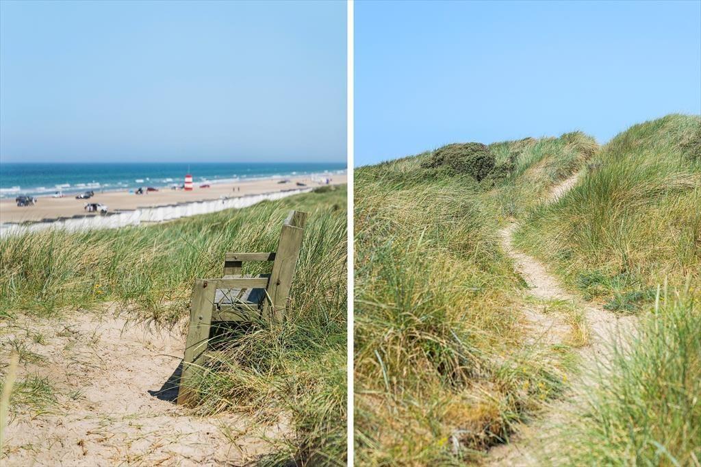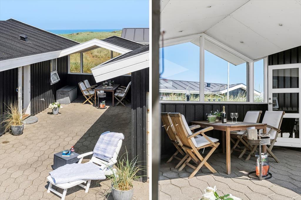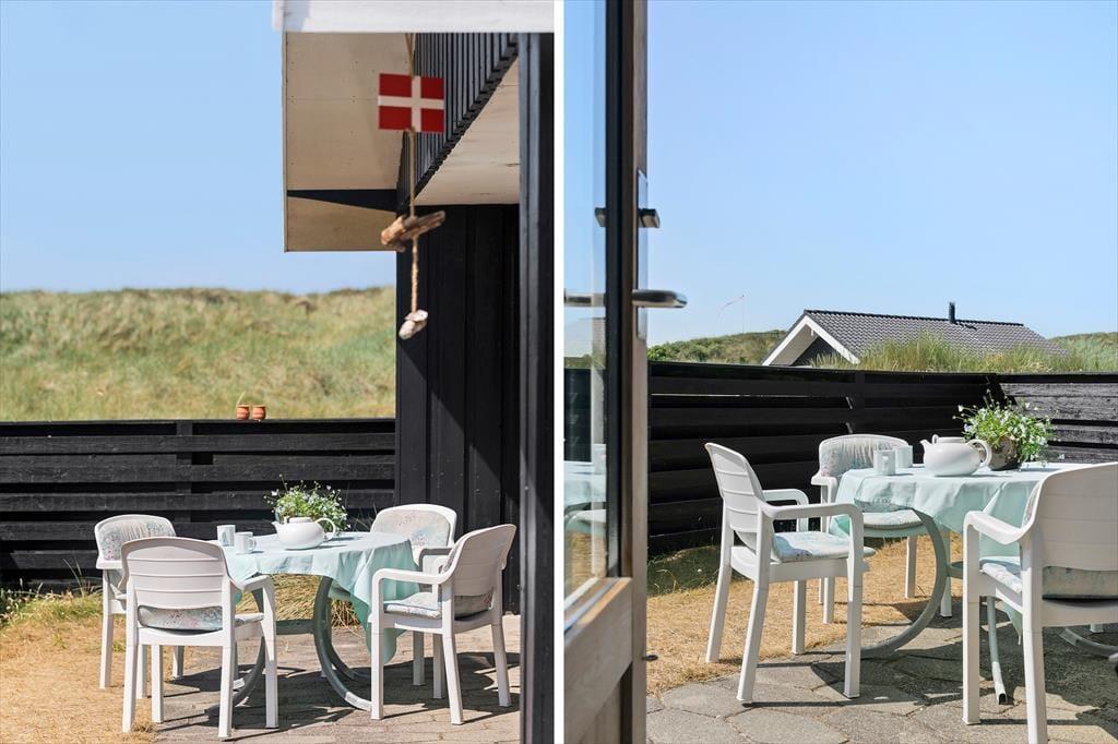 Eine gepflasterte und teilweise abgeschirmte Terrasse erstreckt sich nach Süden und zwischen dem Haus und dem Annex, sodass ihr reichlich Gelegenheit habt, einen Platz zum Entspannen mit Windschutz und Sonne zu finden. Von der überdachten Terrasse aus könnt ihr sogar das Meer hinter den Dünen sehen, aber wenn ihr den Meerblick wirklich genießen wollt, müsst ihr den Weg zum Aussichtsbänken auf dem Dünengrund nehmen, von wo aus ihr einen schönen Panoramablick auf den Strand und das offene Meer habt.