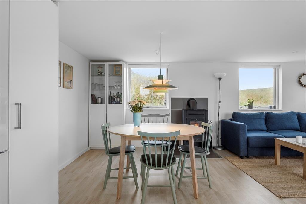 Schon beim Betreten des Ferienhauses in der Bettysvej 12 spürst du die helle und einladende Atmosphäre. Die großen Fenster lassen viel Tageslicht herein und schaffen ein angenehmes Ambiente, das sofort für Urlaubsstimmung sorgt. Im Herzen des Hauses befindet sich der Wohnbereich, in dem Küche und Wohnzimmer in einem offenen und harmonischen Grundriss miteinander verbunden sind. Hier kannst du die Mahlzeiten des Tages zubereiten, während die Gespräche am Esstisch frei fließen und die Familie den nächsten Ausflug plant. Wenn der Abend hereinbricht, verbreitet der Kaminofen seine wohlige Wärme und sein Knistern im Raum – und es ist der perfekte Moment, es sich mit einer Tasse Tee und einem guten Buch oder einem Film auf dem Sofa gemütlich zu machen.