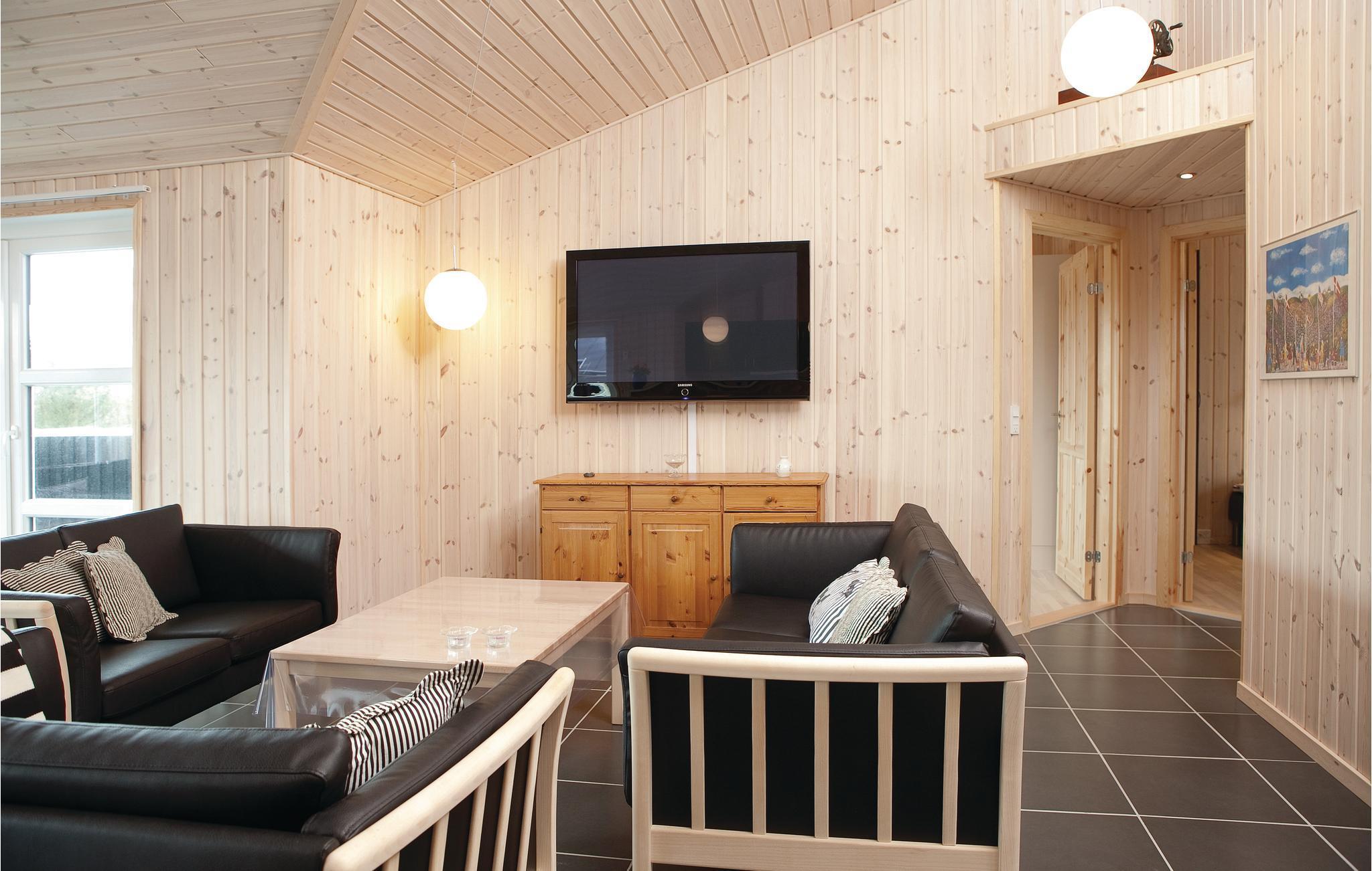 jeweils zwei Schlafzimmer mit gutne Betten und Holzfußboden. In der Mitte des Hauses liegt die helle Küche und das Wohnzimmer mit einer bis unter den First offenen Decke. Die Einrichtung ist gemütlich und es ist Holzfußboden verlegt. Die Terrasse vor dem Wohnzimmer ist eingezäunt, ideal wenn Sie kleine Kinder haben. Das geräumige Grundstück bietet viel Platz zum Spielen.