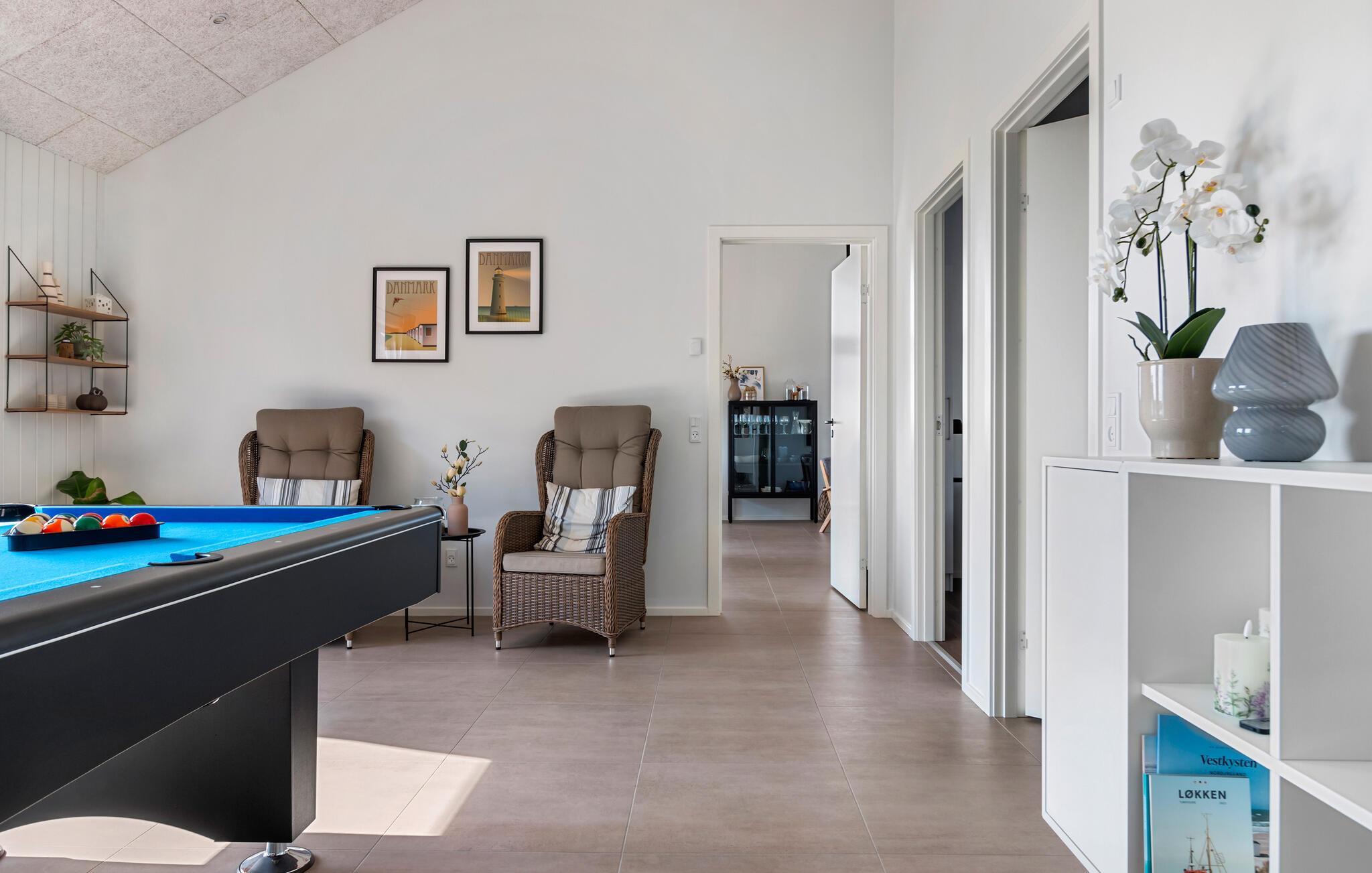 Ihr gemütliches Urlaubsdomizil, ideal gelegen zwischen den beliebten Ferienorten Løkken und Blokhus, lädt Sie ein, die einzigartige Natur und die entspannende Atmosphäre der dänischen Westküste hautnah zu erleben. Entfliehen Sie dem Alltag und genießen Sie erholsame Tage in diesem großzügigen Ferienhaus, das sowohl Komfort als auch Gemütlichkeit vereint. Die offene Gestaltung der Räume bietet Ihnen eine wunderbare Umgebung zum Entspannen. Machen Sie es sich auf den komfortablen Sofas bequem und essen Sie gemeinsam am Esstisch mit Blick nach draußen. Für vergnügliche Unterhaltung sorgt der Billardtisch.