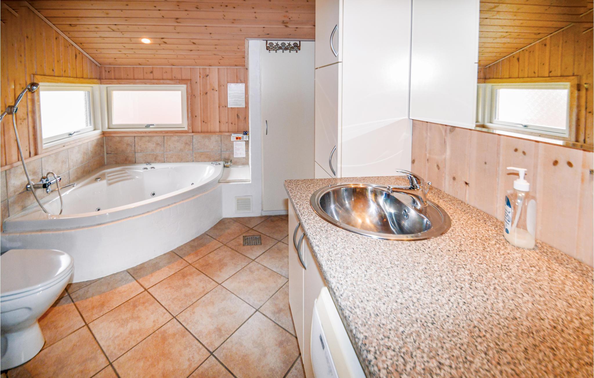 Schönes Luxushaus auf großem Naturgrund. Der Badestrand von Løkken liegt im Gehabstand vom Ferienhaus. Ein Qualitätshaus bestehend aus guten Materialien, die Decken sind bis unter den First offen und die Wände sind mit hellem Holz verkleidet. Im großen Aufenthaltsraum finden Sie die Küche, die Essecke und den Wohnbereich mit dem Kaminofen. Im der Wohnküche und im Bad wurde an schönen Details nicht gespart, hier ist auch Fußbodenheizung. Die Einrichtung im ganzen Haus enstpricht einem hellen, skandinavischen Stil. Die großen Fenster lassen auch viel Licht ins Innere kommen. Sie sehen oft Hasen und Rehe im Garten, ihnen schmecken die Pflanzen auf dem Grundstück besonders. Auf den großen Terrassen gibt es Windschutz. Løkken faszieniert zu jeder Jahreszeit. Wenn es im Herbst nach einem Sturm wieder ruhig wird, haben Sie Gelegenheit am Strand Bernstein zu finden. Schmuck wird hier lokal auch von der vielen schönen Steinen hergestellt. In diesem Gebiet werden Sie Ihrer ganzen Familie einen schönen Urlaub verbringen. Hier finden Sie kilometerlange breite, weiße Sandstrände, die bei Kennern zu Nordeuropas zu den besten Sandstränden mit lauschigen Dünenmulden zählen. Doch auch die Umgebung mit ihrer fantastischen Natur lädt zu Spaziergängen ein. Auf den markierten Reit-, Wander- und Radwegen können Sie diese Herrlichkeiten in Ruhe und Frieden genießen. Golfplätze, Anglerparks, Reiterhöfe und Sporthallen gibt es hier in großer Zahl. Supermarkt und Restaurants sind ganzjährig geöffnet. Besuchen Sie auch das Fårup Sommerland mit Restaurants und 60 Vergnügungen. Der Whirlpool des Hauses hat keine Heizung.