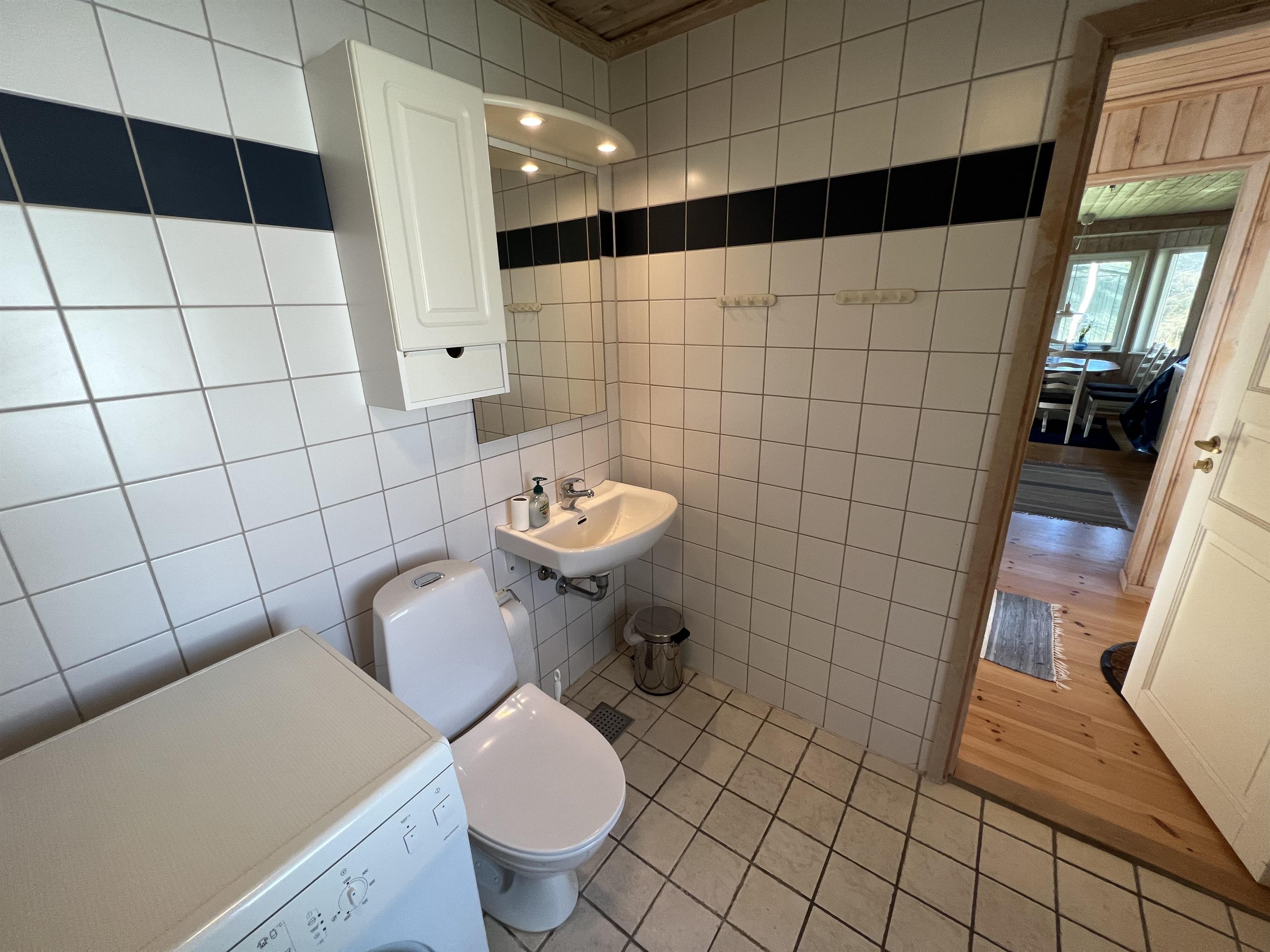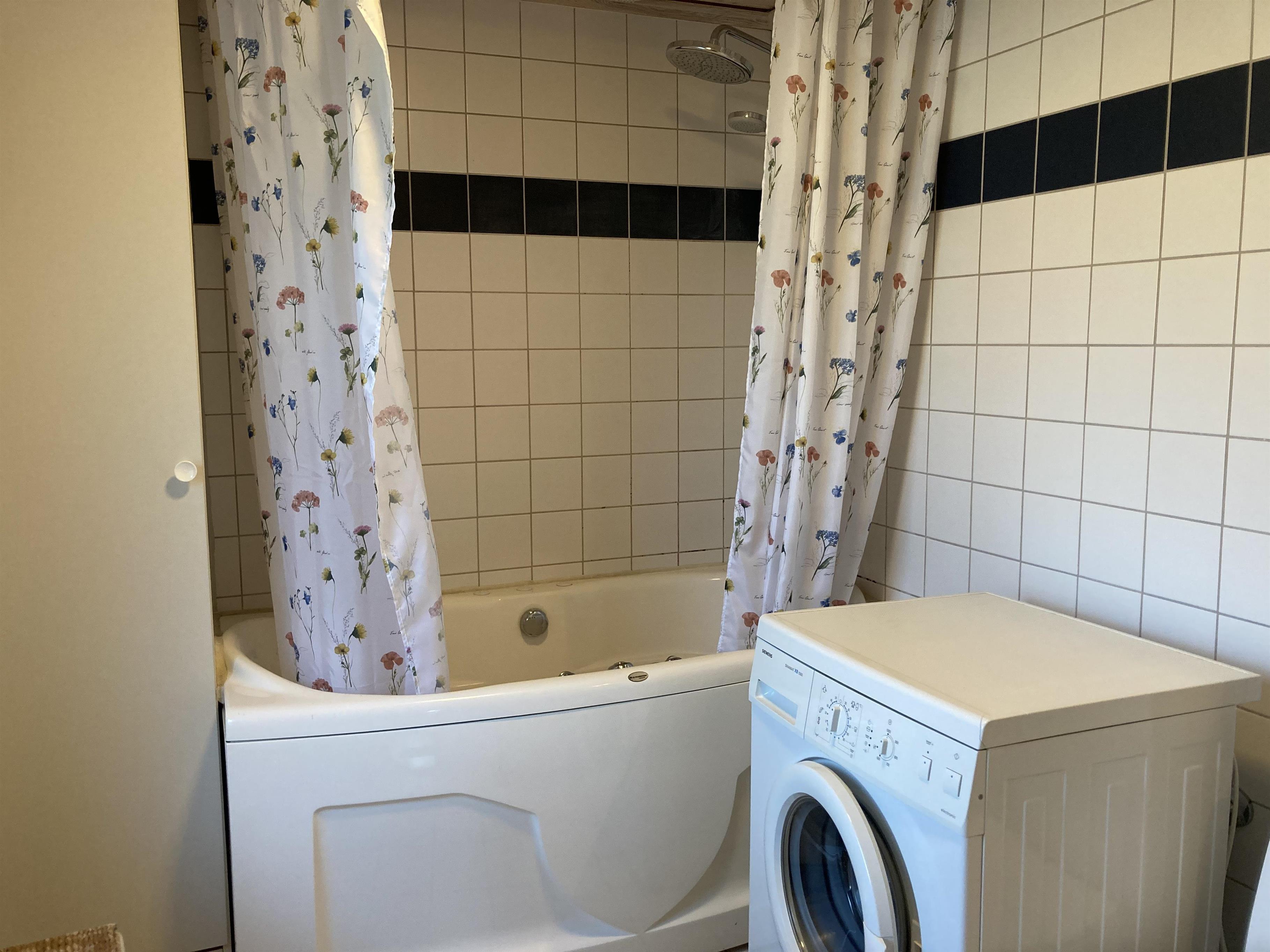 Schönes gefliestes Badezimmer, das über WC, Whirlpool und Waschmaschine verfügt.