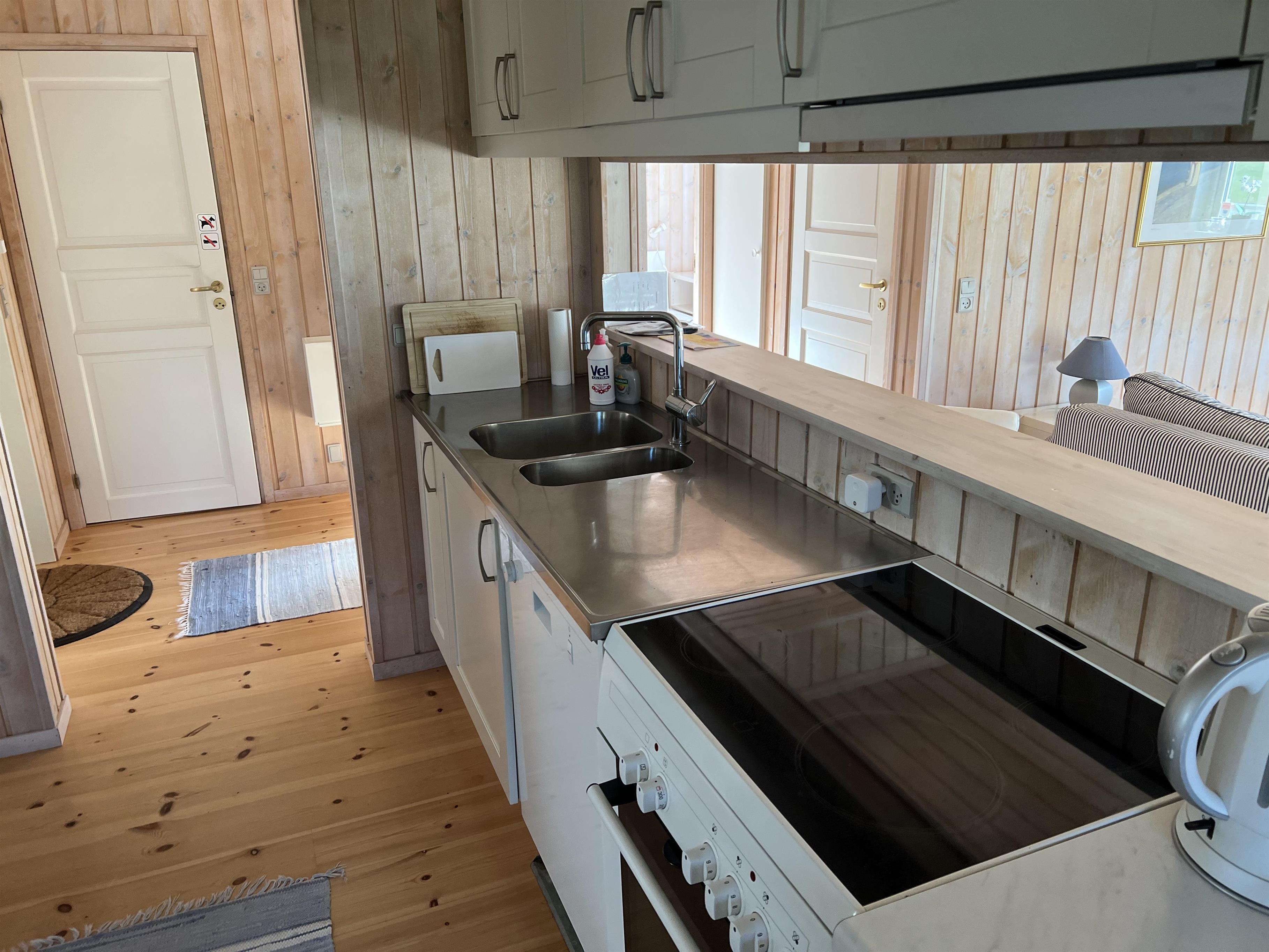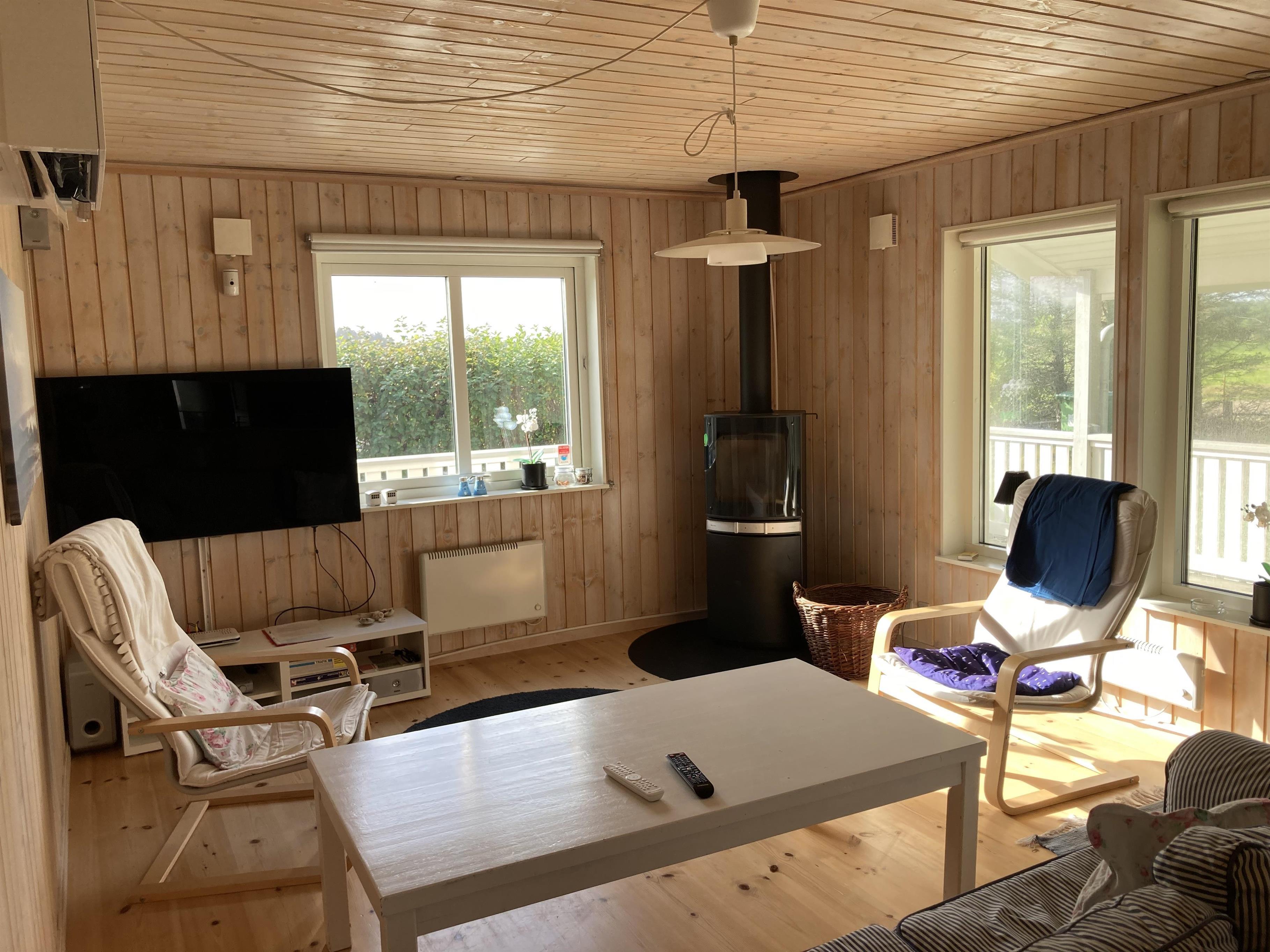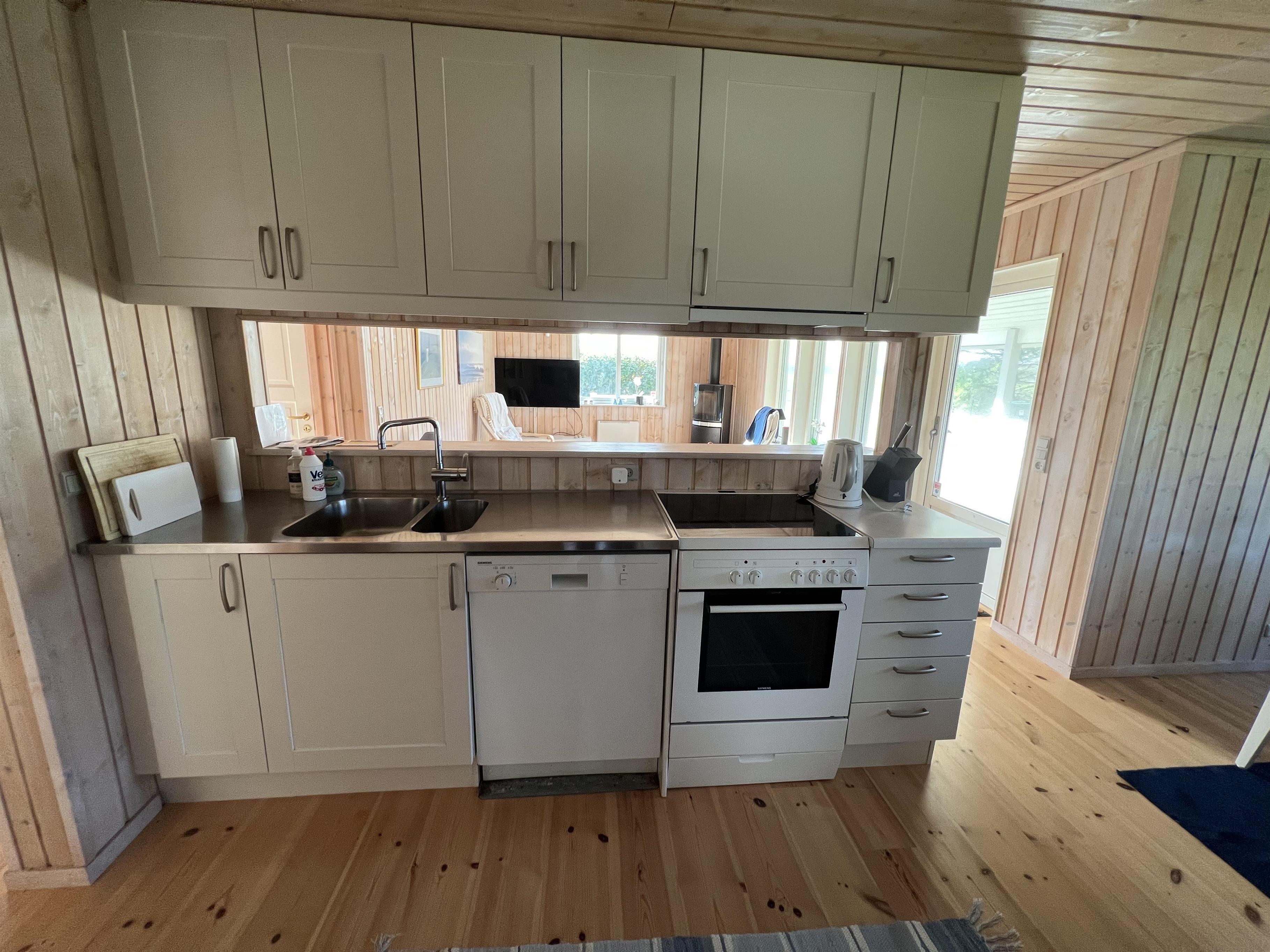 Hier ist ein gemütliches Wohnzimmer mit einem Fernseher mit dänischen und deutschen Kanälen. Die gut ausgestattete Küche mit u.a. Geschirrspüler und Mikrowelle stehen in offener Verbindung mit dem Wohnzimmer und dem schönen Essbereich.