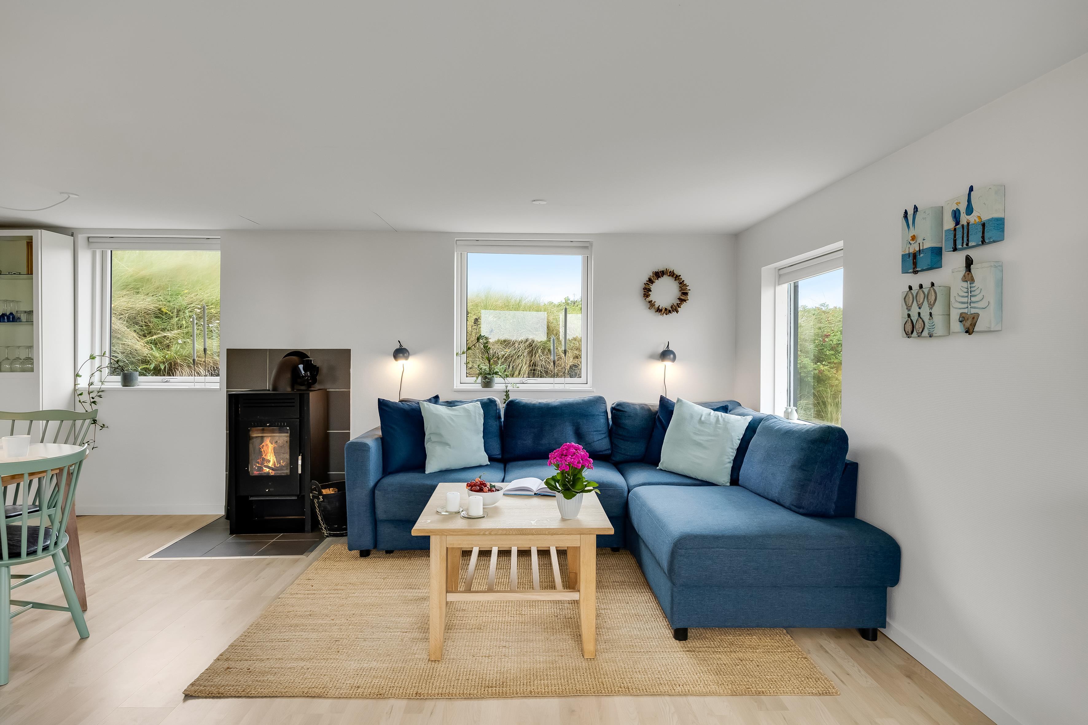 Die großen Fenster lassen viel Tageslicht herein und bieten einen herrlichen Blick auf die umliegende Natur – perfekt für entspannte Stunden in ruhiger Umgebung in der Nähe des Meeres. Dieses Haus ist ein Paradebeispiel für klassische dänische Ferienhausvermietung vom Feinsten.