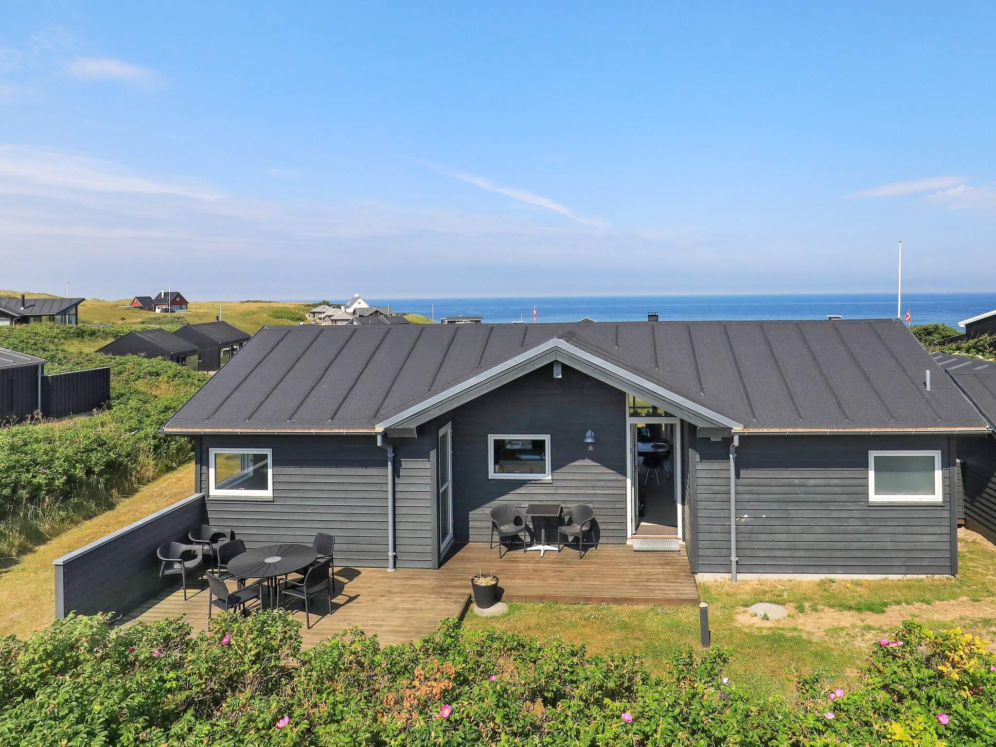 Ferienhaus mit Panoramaaussicht auf die Nordsee, auf einem schönen, 750 m² großen Dünengrundstück, wenige hundert Meter vom Badestrand entfernt gelegen. Das Grundstück eignet sich gut für Ballspiele etc. Von Zimmern, Küche und Wohnzimmer aus haben Sie Panoramablick. Moderne Möblierung mit u.a. Flachbildschirm-TV mit SAT-Empfang und kombiniertem Video/DVD-Player, Konvektionsholzofen und anderen modernen Annehmlichkeiten. Das Haus hat eine Küche, die mit dem Wohnzimmer kombiniert ist und ein Wohnzimmer mit Fliesenboden. Von Zimmern sowie Wohnzimmer besteht Zugang zu den großen Holzterrassen.