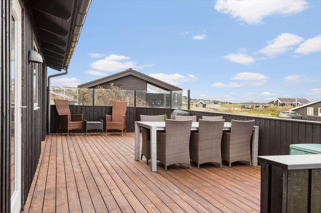 Vom Wohnraum gelangen Sie hinaus auf eine nach Nordwesten gerichtete Terrasse. Diese ist angenehm groß und durch eine Umrandung gut abgeschirmt. Die Terrassenumrandung ist selbstverständlich nur so hoch, dass Sie den Meerblick nicht einschränkt. Auf der anderen Hausseite steht eine weitere schöne Terrasse zur Verfügung, auf der Sie mit Morgensonne und Aussicht auf die Inlandsdünen verwöhnt werden.