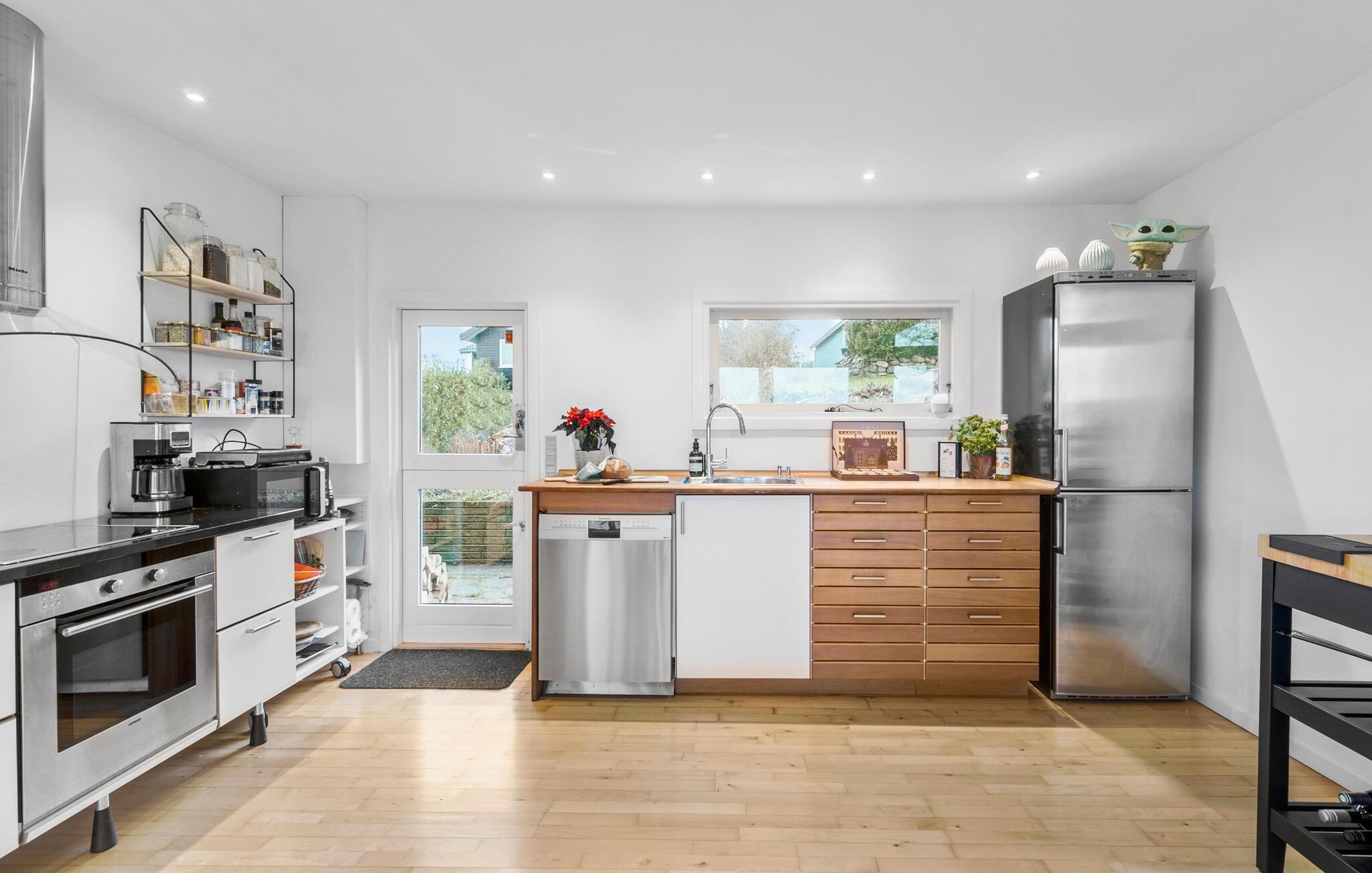Ihr traumhaft gelegenes Haus begeistert mit seiner besonderen Lage direkt am Wasser. Bereits beim Betreten des Hauses fällt der Blick durch die raumhohen Fensterfronten auf das glitzernde Fjordpanorama. Das Innere des Hauses ist lichtdurchflutet, modern eingerichtet und offen gestaltet. Machen Sie es sich im großzügigen Wohnbereich gemütlich, genießen Sie die Wärme des Kaminofens und beobachten Sie das Spiel der Wellen. Die angrenzende Küche ist großzügig ausgestattet und verbindet Funktionalität mit Stil. Der große Esstisch vor dem Panoramafenster ist der ideale Ort für gemeinsame Mahlzeiten.