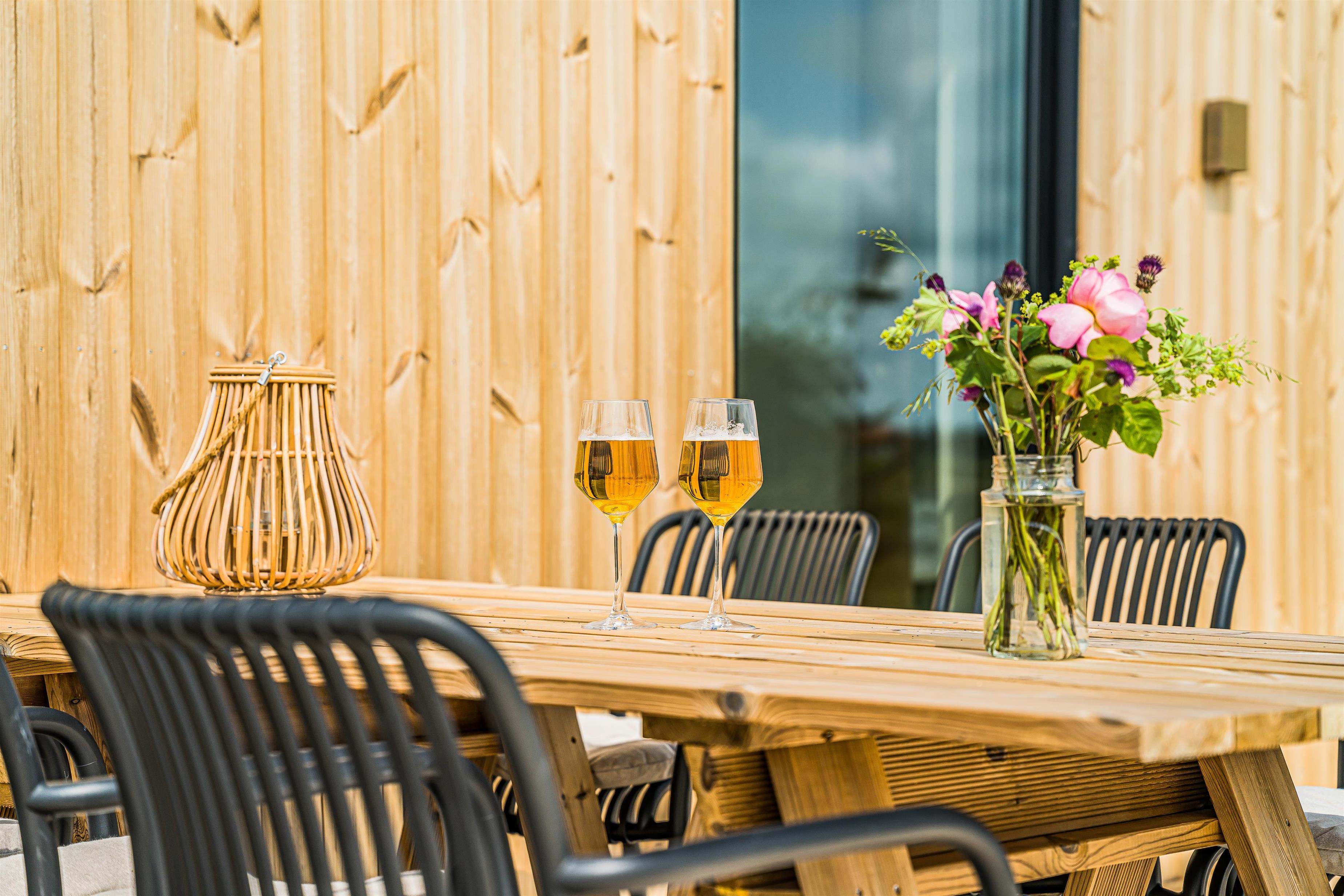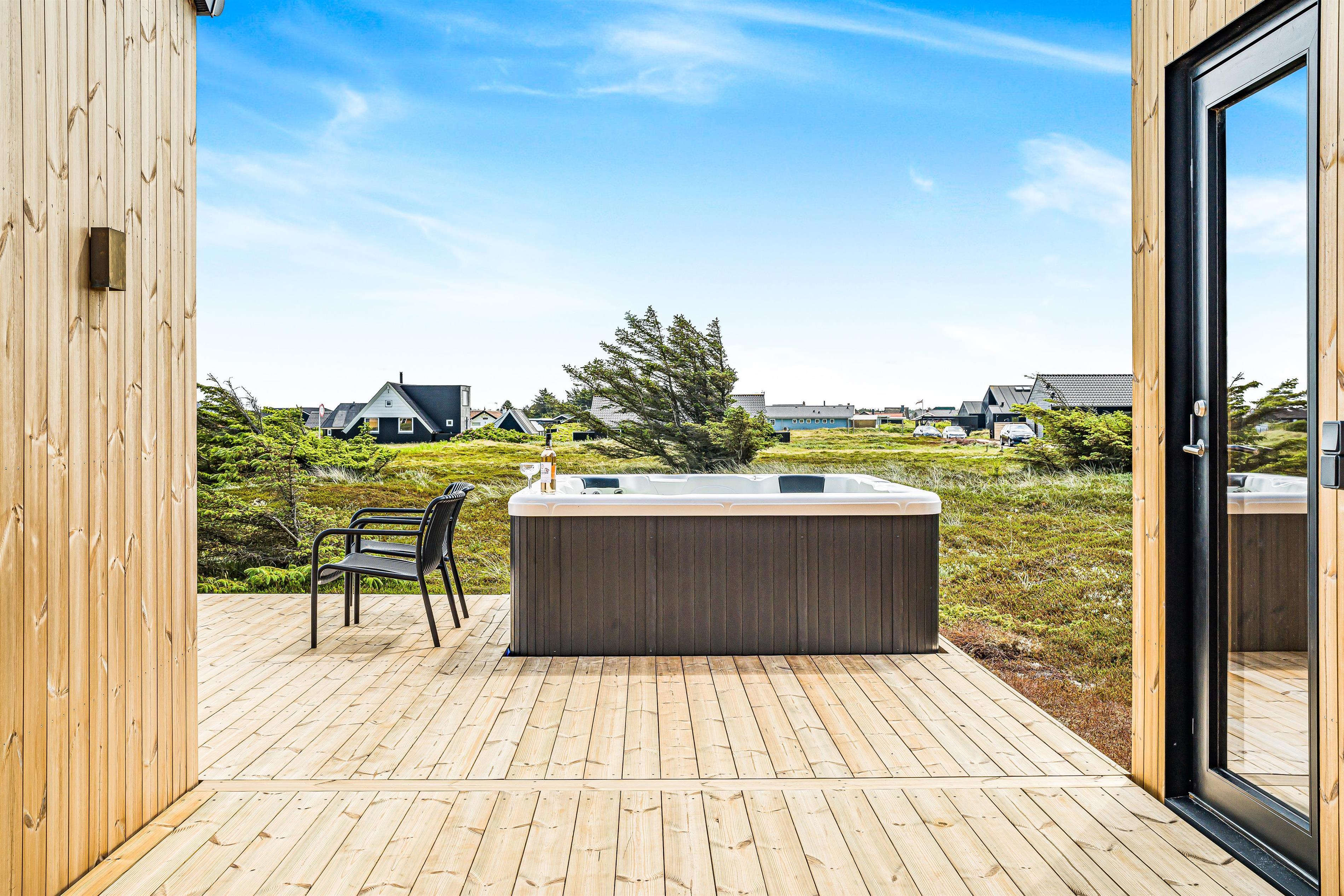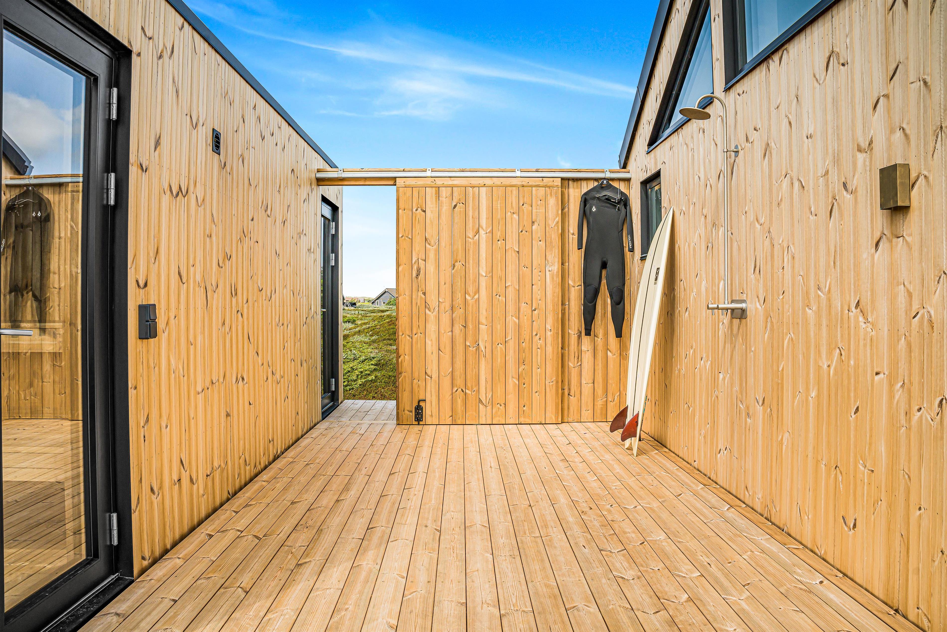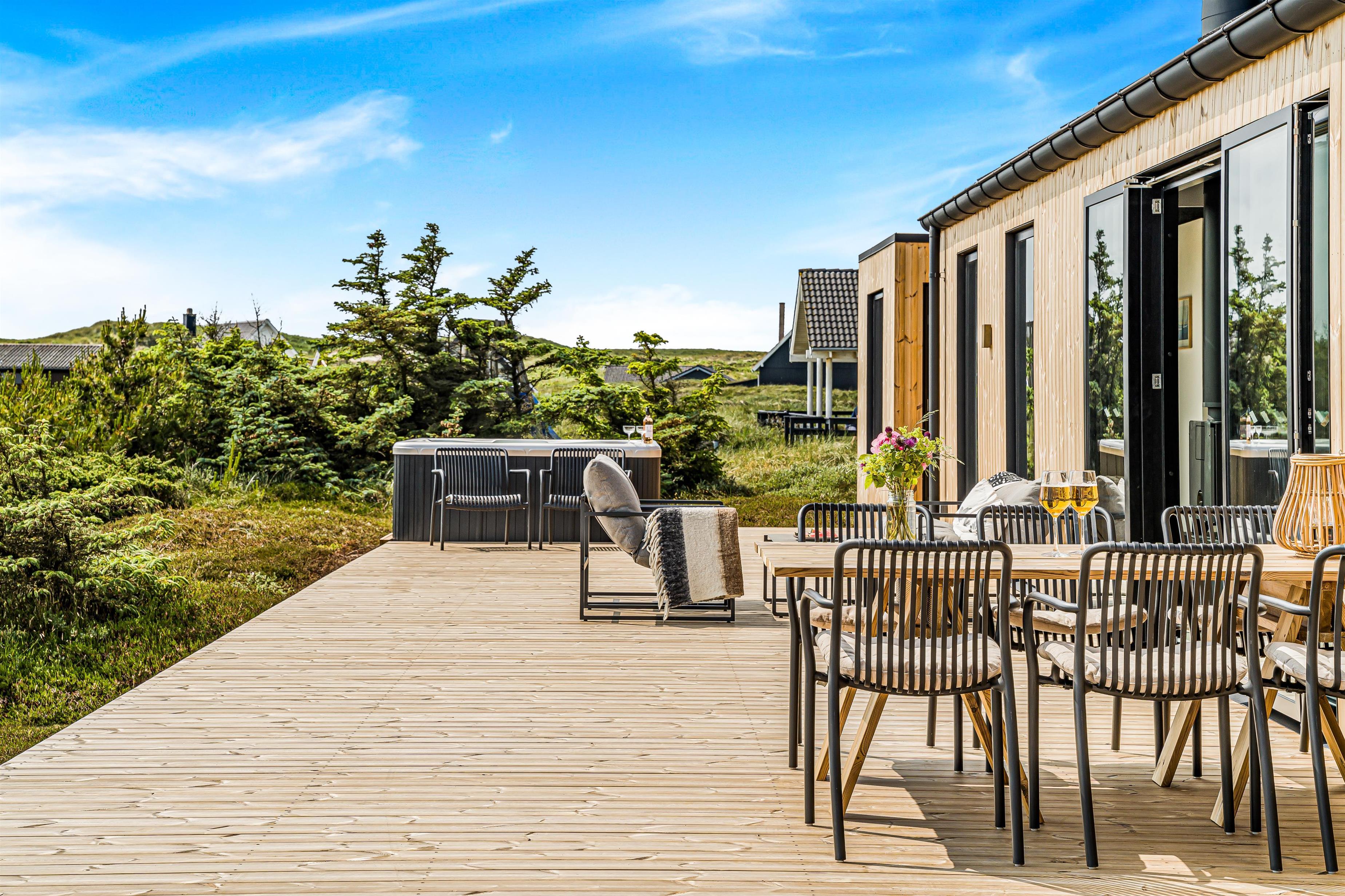 Das Ferienhaus liegt auf einem 2.500 m² großen, hügeligen Naturgrundstück, dessen Außenbereiche ein echtes Highlight sind. Das Haus ist von einer 110 m² großen Holzterrasse mit einem Outdoor-Wellnessbereich umgeben. Hier kann man im luxuriösen Außen-Whirlpool entspannen. War man eine Tour in der Nordsee kann man sich unter der Außendusche abspülen und sich anschließend in der Außensauna aufwärmen.