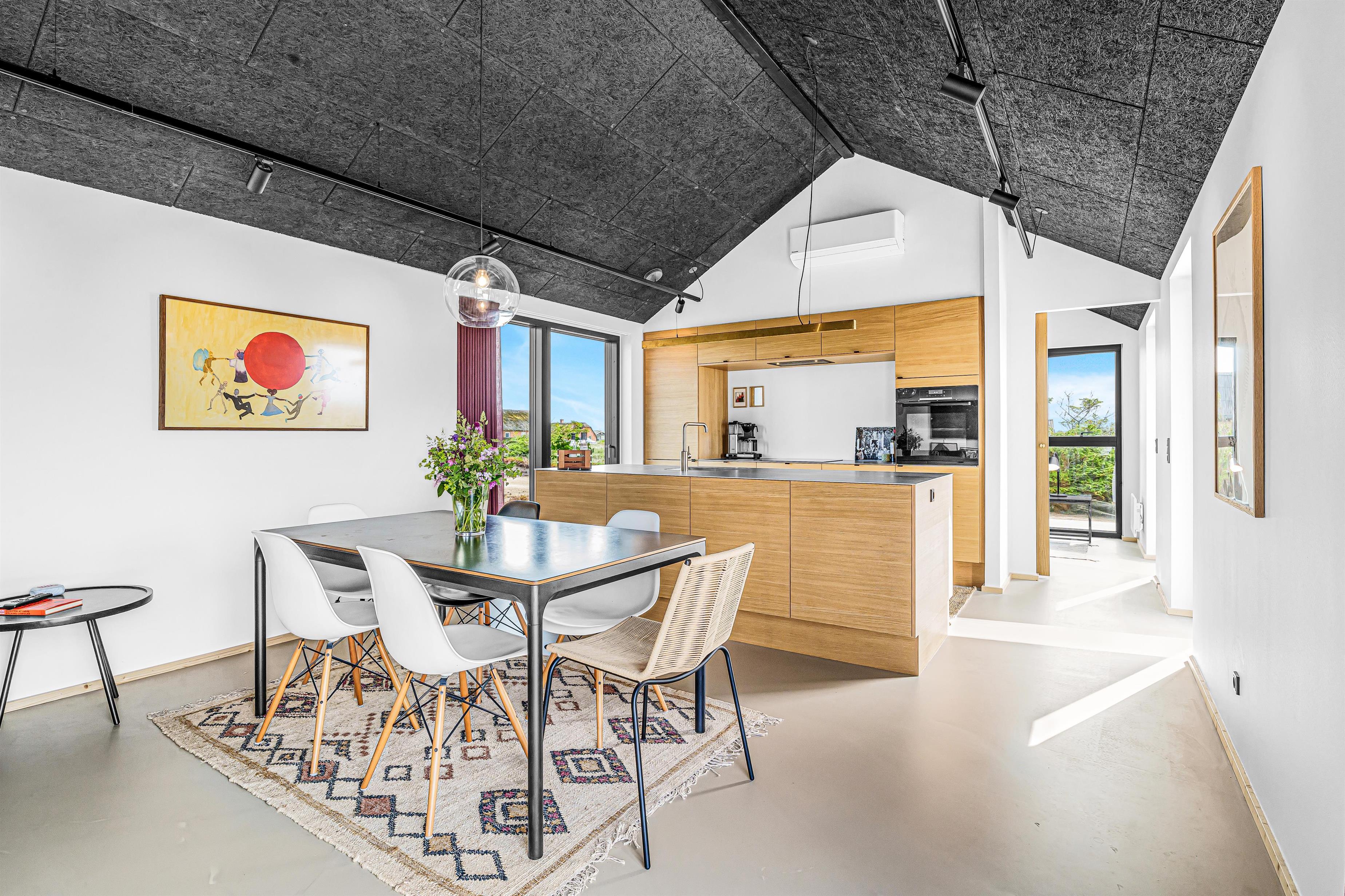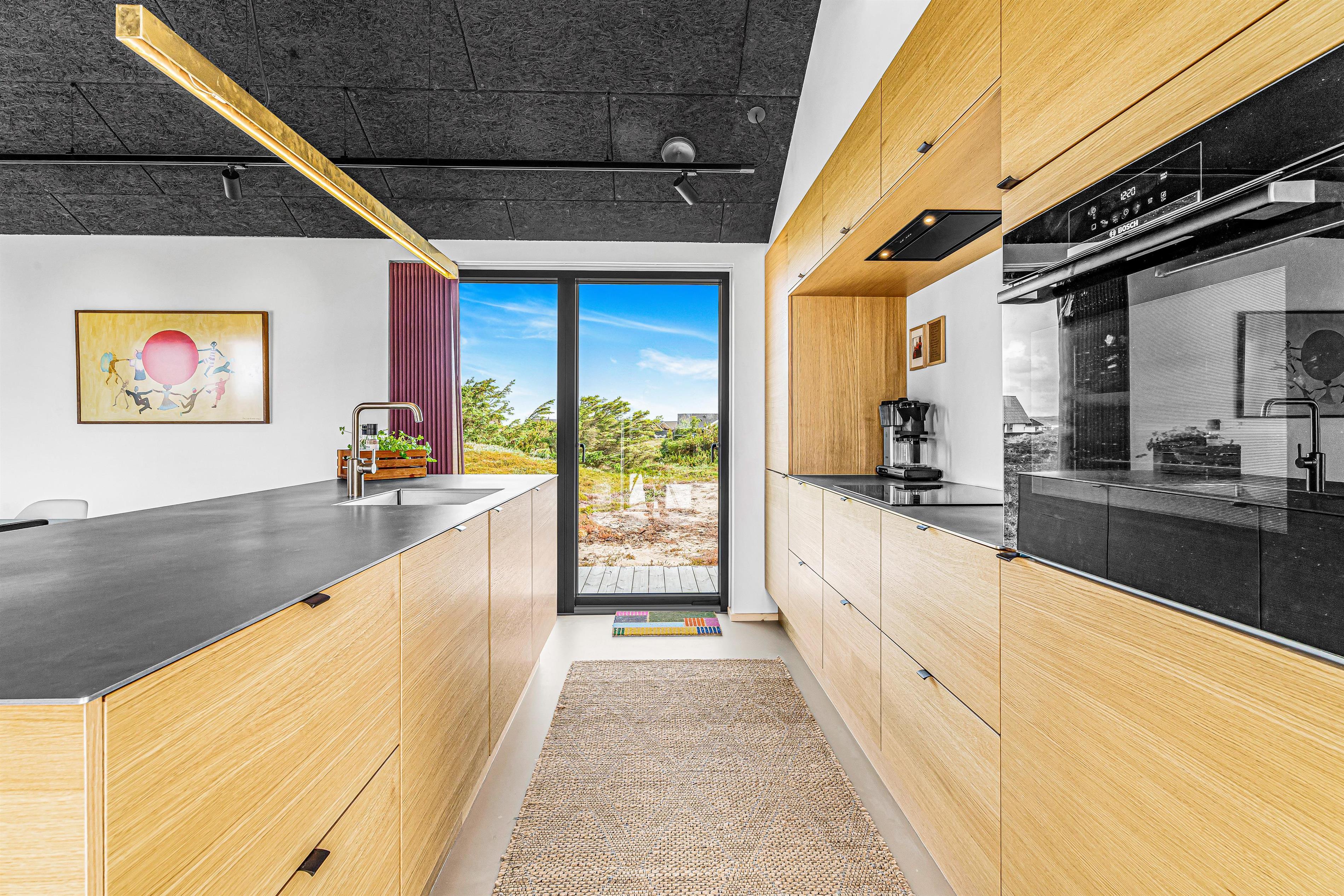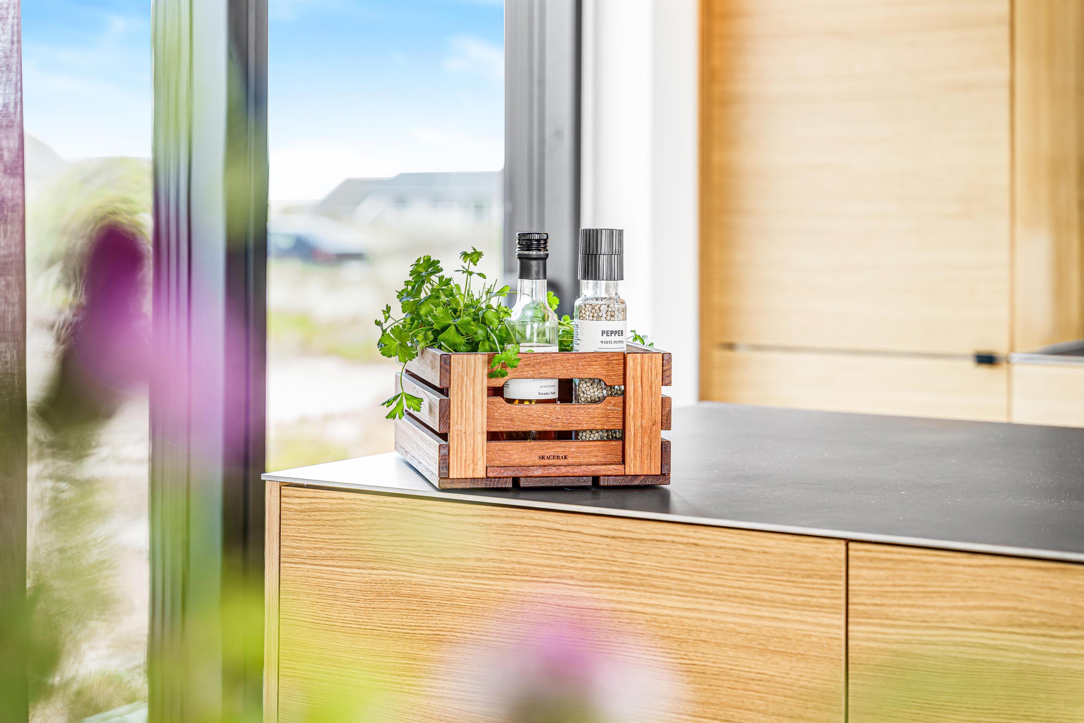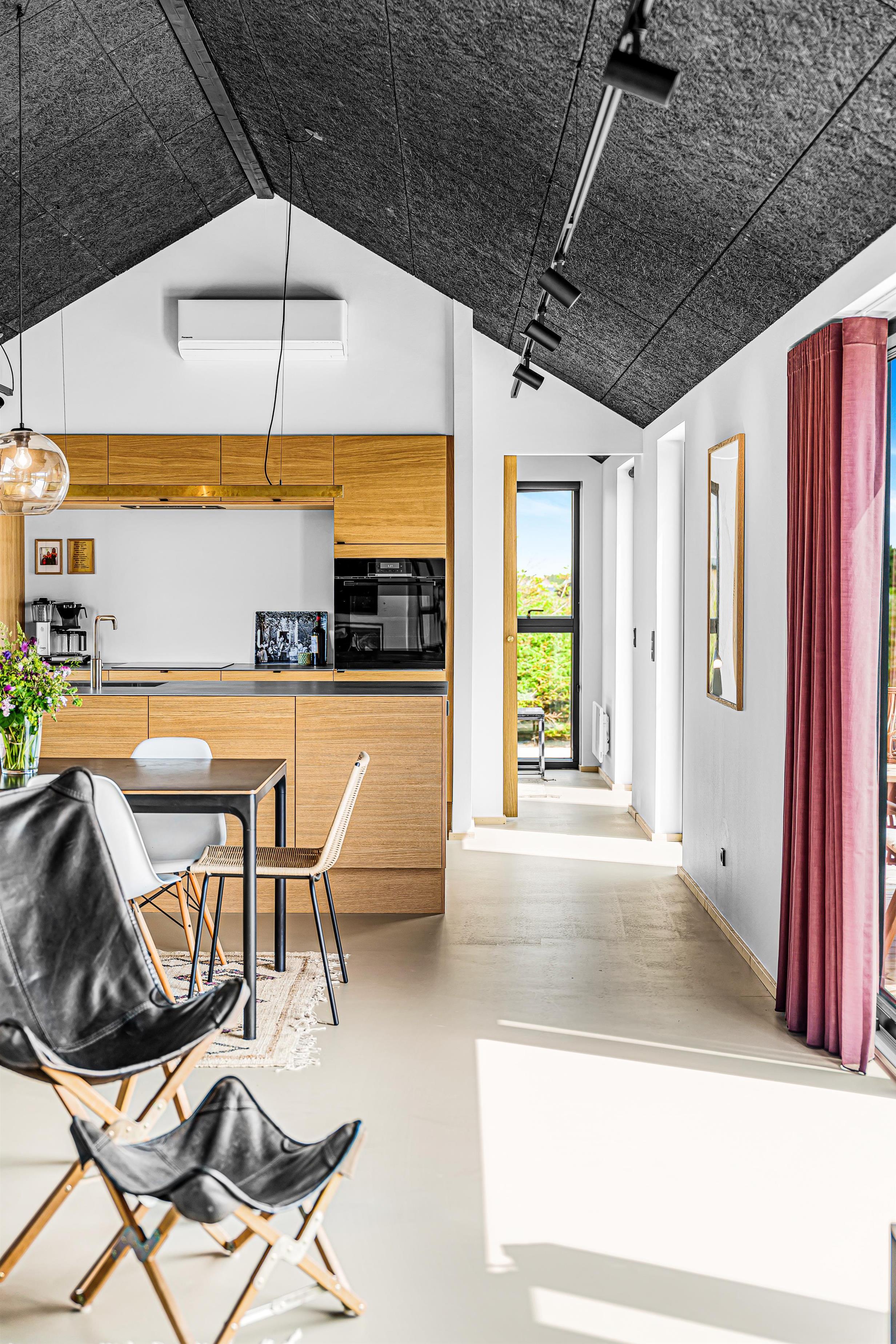 Vom Eingangsbereich gelangt man direkt in den Mittelpunkt des Hauses – ein offener Wohn- und Küchenbereich mit hohen Decken. Hier gibt es ausreichend Platz für alle Gäste, um gemeinsame Zeit zu verbringen. Besonders hervorzuheben sind der Einrichtungsstil und die Materialzusammensetzung des Hauses. Die Küche besteht aus Eichenfurnier mit einer Arbeitsplatte aus Stahl, und im gesamten Wohnbereich wurde ein weicher Epoxy-PU-Boden verlegt. Die Küche ist ausgestattet mit einem Kühl-/Gefrierschrank, einer Spülmaschine, einem Einbaubackofen, Glaskeramik-Kochfeldern, einer Dunstabzugshaube und einer Mikrowelle. Hier ist alles, was man für einen Urlaub an der Nordsee benötigt. Die gemütliche Wohnecke lädt zu entspannten Filmabenden ein und ist mit Ledermöbeln sowie einem Fernseher mit die grosse Pakett Glasfasernetz-TV mit dänischen und deutschen Kanälen ausgestattet. Zudem gibt es einen Chromecast, mit dem eigene Streamingdienste genutzt werden können. Der Wohnbereich kann mit einem Kaminofen beheizt werden, der nicht nur Gemütlichkeit schafft, sondern auch an kalten Wintertagen das gesamte Haus aufwärmen kann.