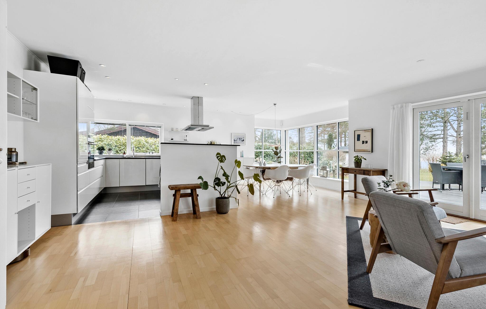 Willkommen zu dieser Oase der Ruhe und zu einem Wohlfühl-Urlaub in einer idealen Lage. Lassen Sie sich von dem eleganten Ambiente Ihres Ferienhauses verzaubern, das Entspannung mit Blick auf die dänische Landschaft verspricht. In der offenen, stilvollen Küche stehen Ihnen alle Möglichkeiten offen, um morgens, mittags und abends den Kochlöffel zu schwingen und Ihre eigenen Lieblingsgerichte zuzubereiten. Genießen Sie bereits beim Frühstück die wunderschöne Aussicht auf die Bucht Lejre Vig im Roskilde Fjord. Auch vom behaglichen Wohnbereich mit Kaminofen eröffnet sich der Blick auf das ruhige Blau des Meeres. Große Glastüren führen hinaus auf die einladende Terrasse, die mit schönen Gartenmöbeln zum Verweilen in der frischen Luft einlädt. Spielen Sie mit Ihren Kindern Fußball im Garten und gönnen Sie sich auch eine Pause auf der gemütlichen Bank am Feuerplatz.