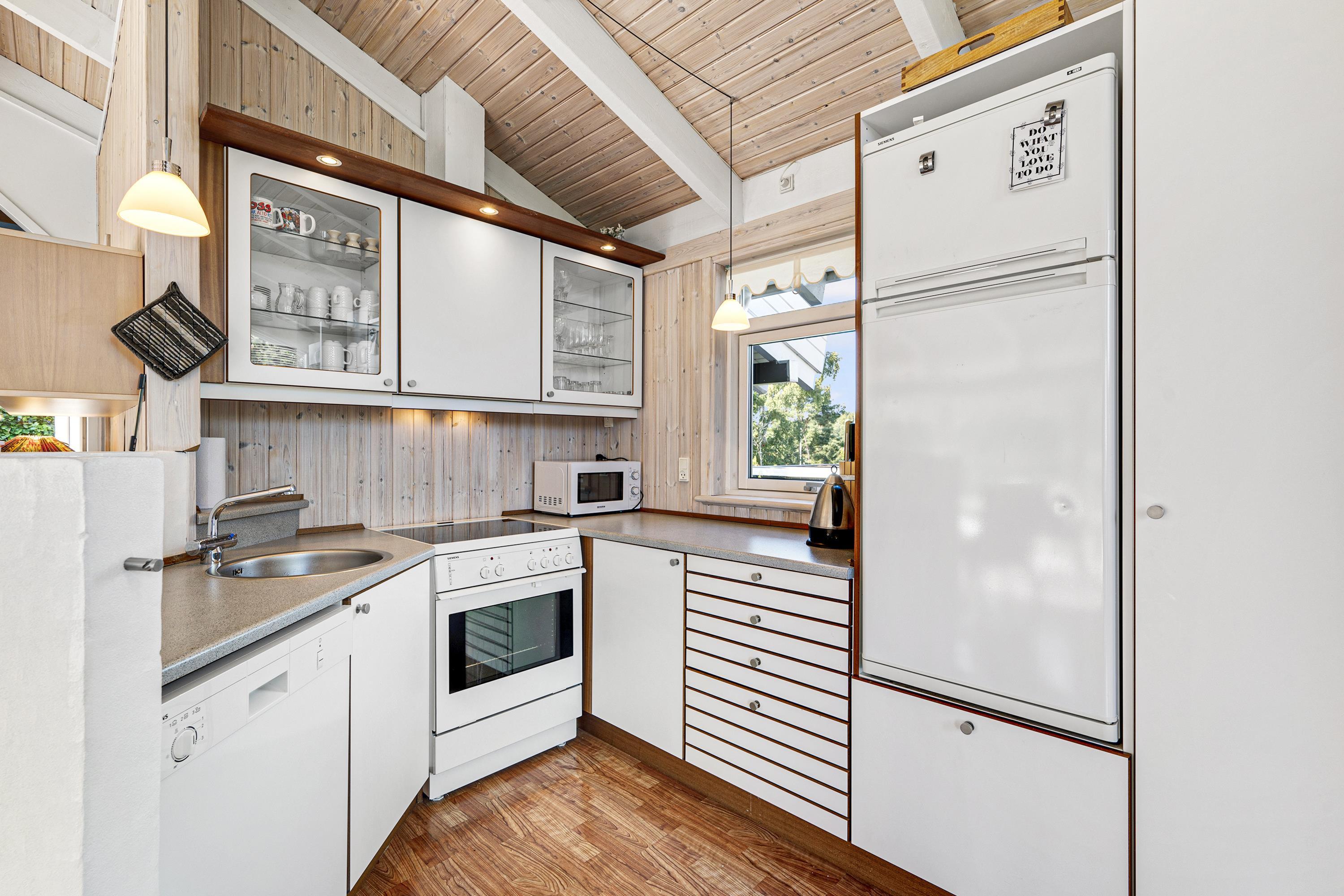 Vom geräumigen Eingangsbereich gelangt man in das große, helle Wohnzimmer mit Panoramafenstern. Es ist mit Essplatz für sechs Personen, schöner Sofaecke, Kaminofen, Fernseher mit dänischen (inkl. TV2) und deutschen Programmen, Chromecast sowie Radio ausgestattet. In offener Verbindung dazu liegt die große, gut ausgestattete Küche mit Glaskeramikherd, Kühl-/Gefrierkombination, Geschirrspüler und Mikrowelle.