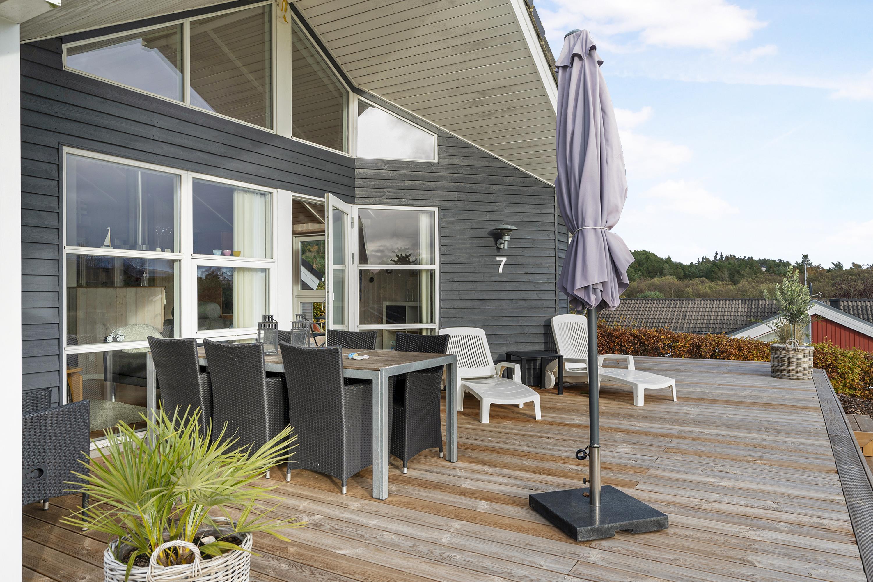 Dieses schöne Ferienhaus liegt hoch auf einem offenen Naturgrundstück in den Hügeln am Lyngsbæk Strand. Schöne, große und teilweise überdachte Holzterrasse mit guten Gartenmöbeln, Liegestühlen, Sonnenschirm und Grill, wo man die Sonne genießen kann. Auf dem Grundstück befinden sich ein Sandkasten, Schaukeln und ein Fußballtor.