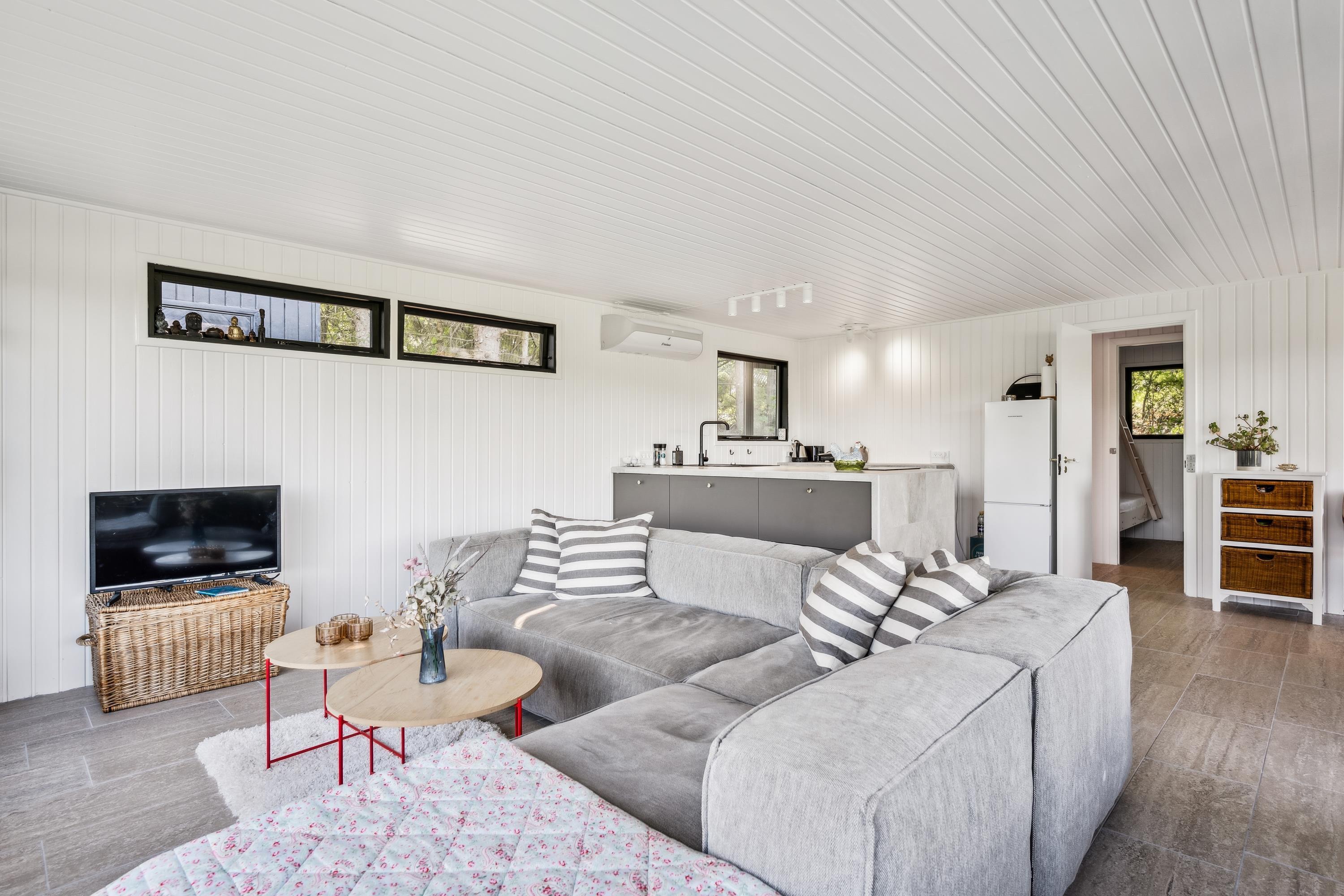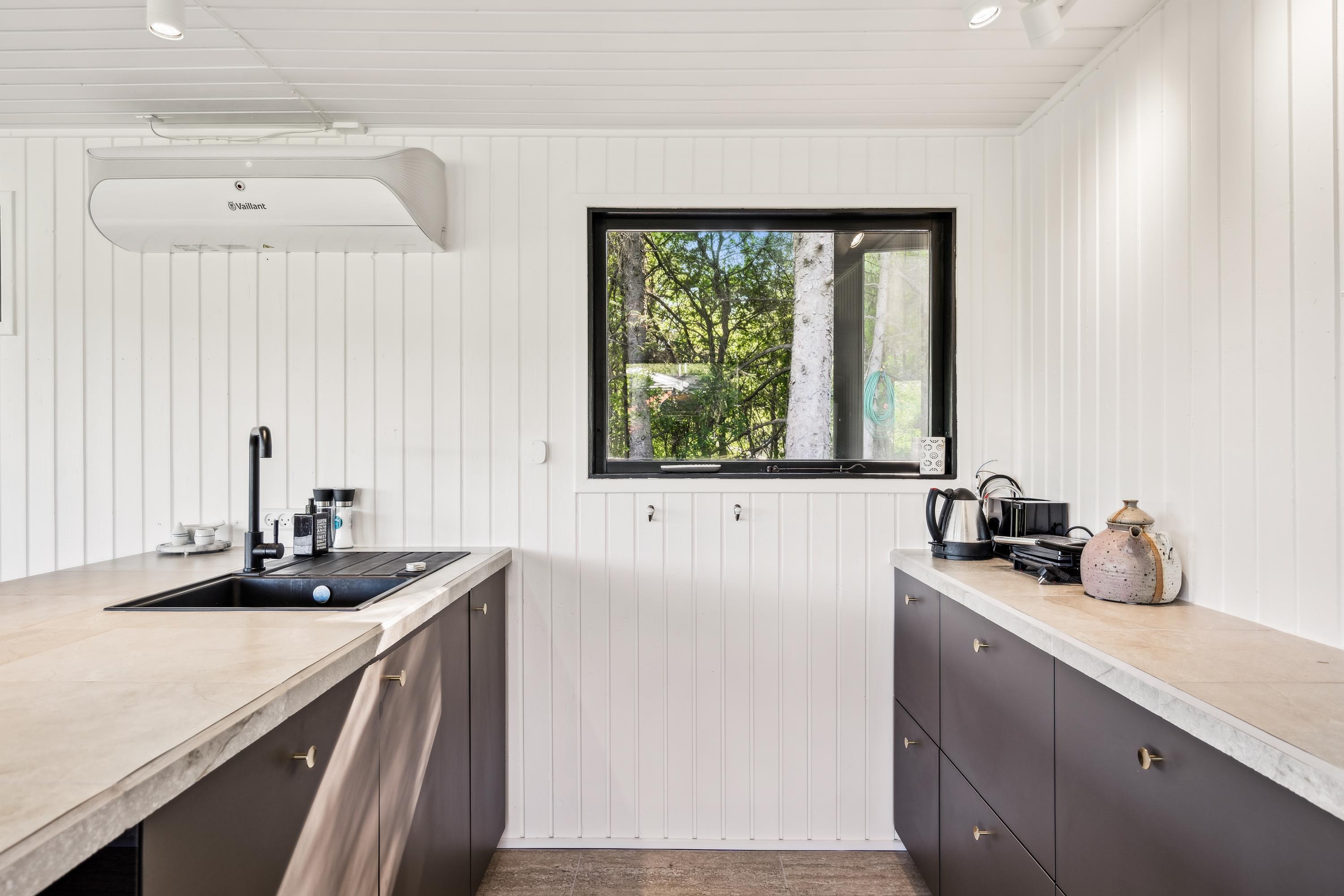 In der schönen Natur, nicht weit vom Lyngsbæk Strand und dem Nationalpark Mols Bjerge entfernt, befindet sich dieses ältere, aber komplett renovierte und gemütliche Ferienhaus. Das Ferienhaus bietet ein helles, freundlich eingerichtetes Wohnzimmer mit Wärmepumpe und Biogasofen sowie Zugang zur überdachten Terrasse mit Gartenmöbeln. Angrenzend an das Wohnzimmer liegt die neue, moderne Küche, unter anderem mit Geschirrspüler. Auch das Badezimmer ist neu und verfügt über eine Dusche. Die Schlafplätze verteilen sich auf zwei Schlafzimmer – eines mit einem Doppelbett und eines mit einem ¾-Bett und einem Etagenbett darüber.