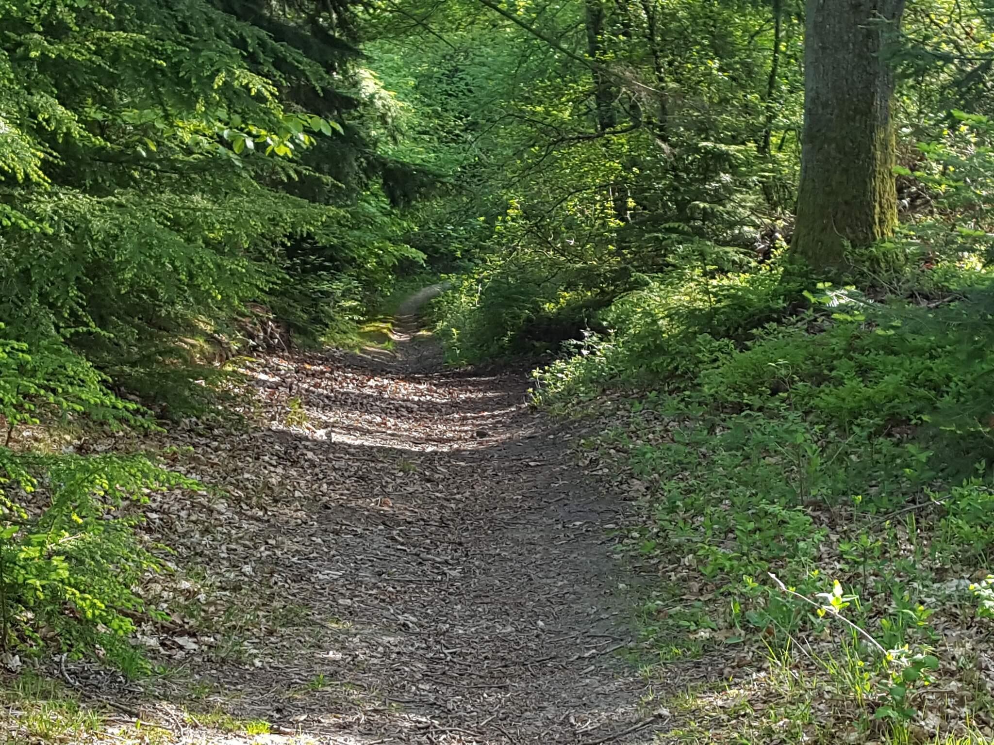 Das zugehörige Grundstück mit Bäumen ist abfallend, das Haus liegt ganz oben platziert und vermittelt einem daher von innen das Gefühl, quasi oben in der Baumkrone zu sitzen. Mit etwas Glück bekommen Sie im Garten ein scheues Reh oder Eichhörnchen vor die Kamera. Das Grundstück grenzt direkt an den Wald und bietet sich auch als Spielfläche für die Kinder an.