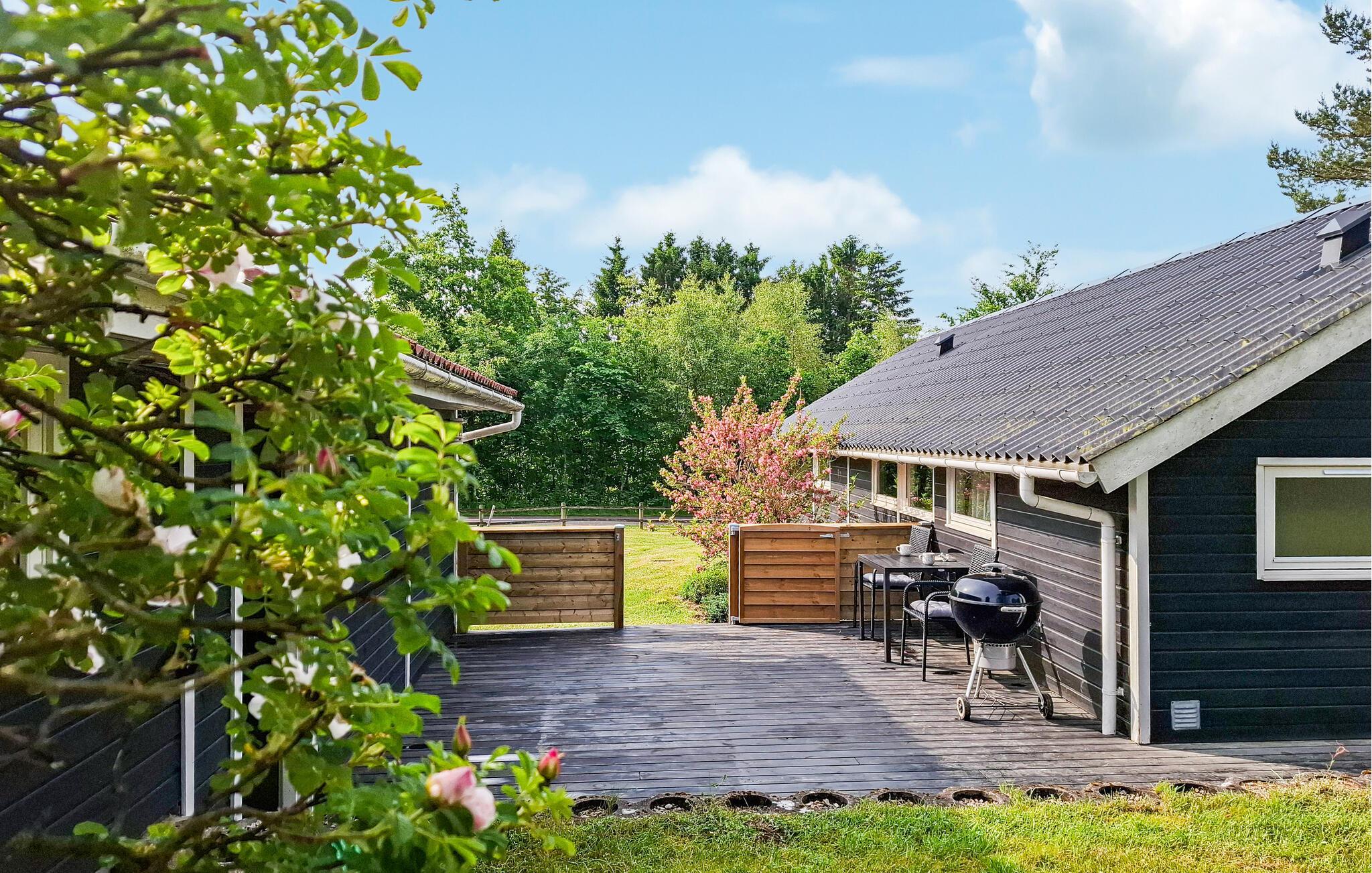 Modernes Ferienhaus in Lyngsbæk mit großer Holzterrasse und ruhigem Garten, ideal für erholsame Tage nahe Ebeltoft Vig.