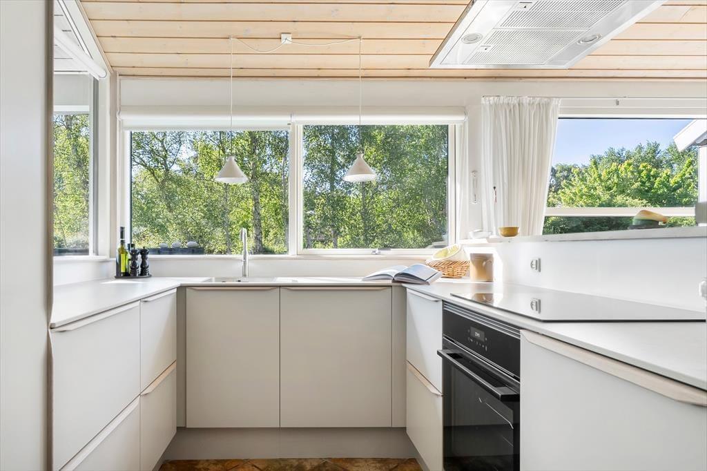 Køkkenet er åbent og har vinduer med udsigt til haven og den østvendte terrasse, hvilket giver et dejligt lysindfald og udsigt over haven. Rundt om spisebordet er der god plads til, at I alle kan nyde måltiderne sammen. Når vejret tillader det, kan I via havedøren gå direkte ud på terrassen og spise under åben himmel eller den delvis overdækket terrasse.