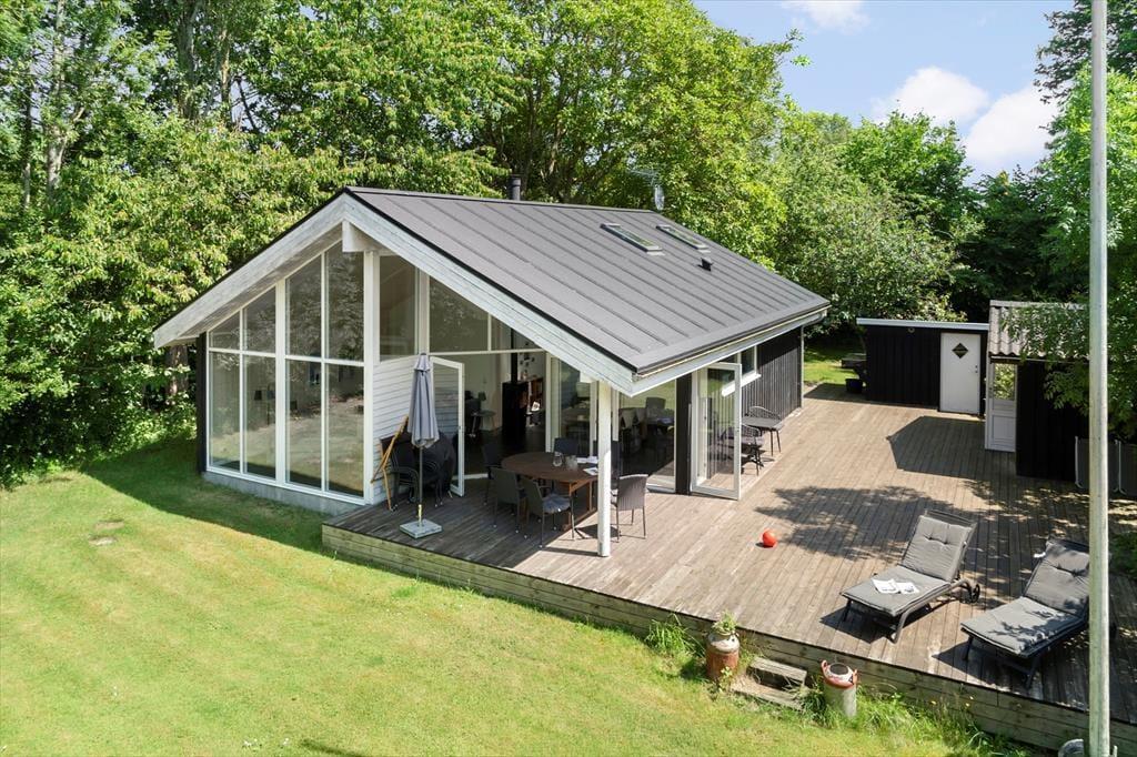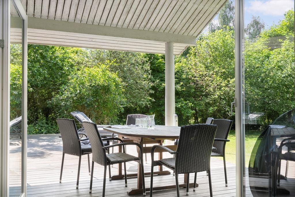 Den overdækkede terrasse er oplagt til måltider i det fri eller en stille stund med en god bog. Huset har to terrasser – én mod sydvest og én mod øst – og morgenkaffen bør uden tvivl nydes her.