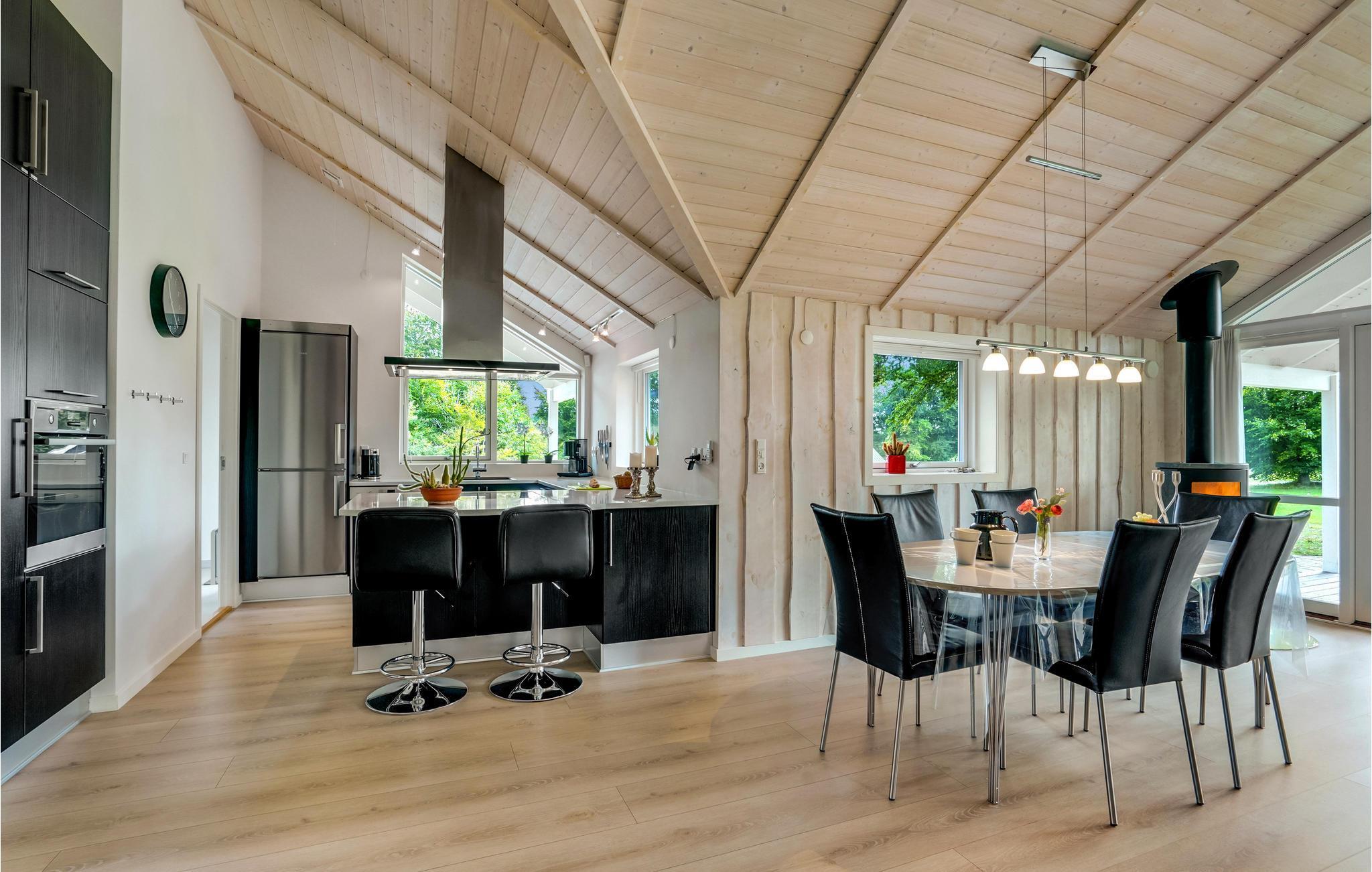 In grüner Umgebung, nur wenige hundert Meter vom Mariager Fjord entfernt begrüßt Sie dieses tolle Ferienhaus. Im Innenraum erwartet Sie ein helles und einladendes Intereiur, das für einen komfortablen Urlaub komplett ausgestattet ist. Verbringen Sie im offenen Wohnbereich mit Fensterfront viele gesellige Stunden mit der Familie. Machen Sie sich es abends in den Polstermöbeln in geselliger Runde bequem und wärmen Sie sich an kühlen Abenden vorm Kaminofen.